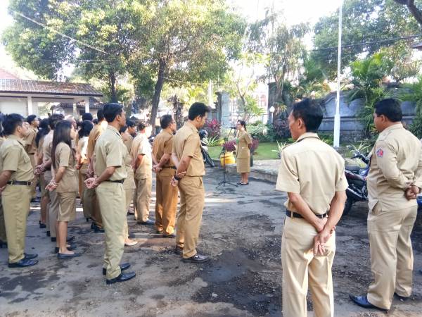 Pengarahan yang disampaikan dari Ibu Pimpinan yaitu terkait surat edaran peraturan dari Gubernur Bali mengenai penggunaan pakaian adat Bali pada setiap hari Kamis, Hari Purnama, Hari Tilem, Hari Jadi Provinsi Bali dan HUT Kota. Ibu Plt. Kepala Dinas menginstruksikan kepada seluruh karyawan/karyawati agar mentaati dan melaksanakan peraturan tersebut.