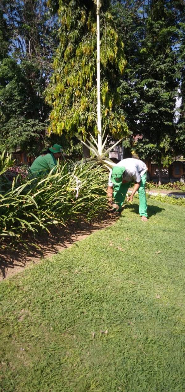Tenaga Kontrak Teknis Lainnya (Tenaga Pertamanan) Dinas Perumahan, Permukiman dan Pertanahan Kabupaten Buleleng melakukan pemupukan tanaman di taman telajakan di seputaran kota Singaraja. Tujuan utama pemupukan adalah untuk mendukung pertumbuhan tanaman. Penggunaan pupuk yang efisien pada dasarnya adalah memberikan pupuk dan jumlah yang sesuai dengan kebutuhan tanaman, dengan cara yang tepat dan pada saat yang tepat sesuai dengan kebutuhan dan tingkat pertumbuhan tanaman tersebut. Pemberian pupuk harus berdasarkan dosis yang telah di tentukan dalam kemasan pupuk.