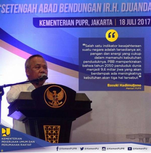 "Untuk ke depannya pekerjaan besar kita adalah untuk terus mengoptimalkan kemanfaaatan Bendungan Jatiluhur yang sudah berumur 50 tahun di Wilayah Sungai Citarum," kata Menteri Basuki saat membuka acara Seminar Nasional “Setengah Abad Bendungan Ir. H. Djuanda Menghidupi Negeri”di Kantor Kementerian PUPR, Jakarta, Selasa (18/7).