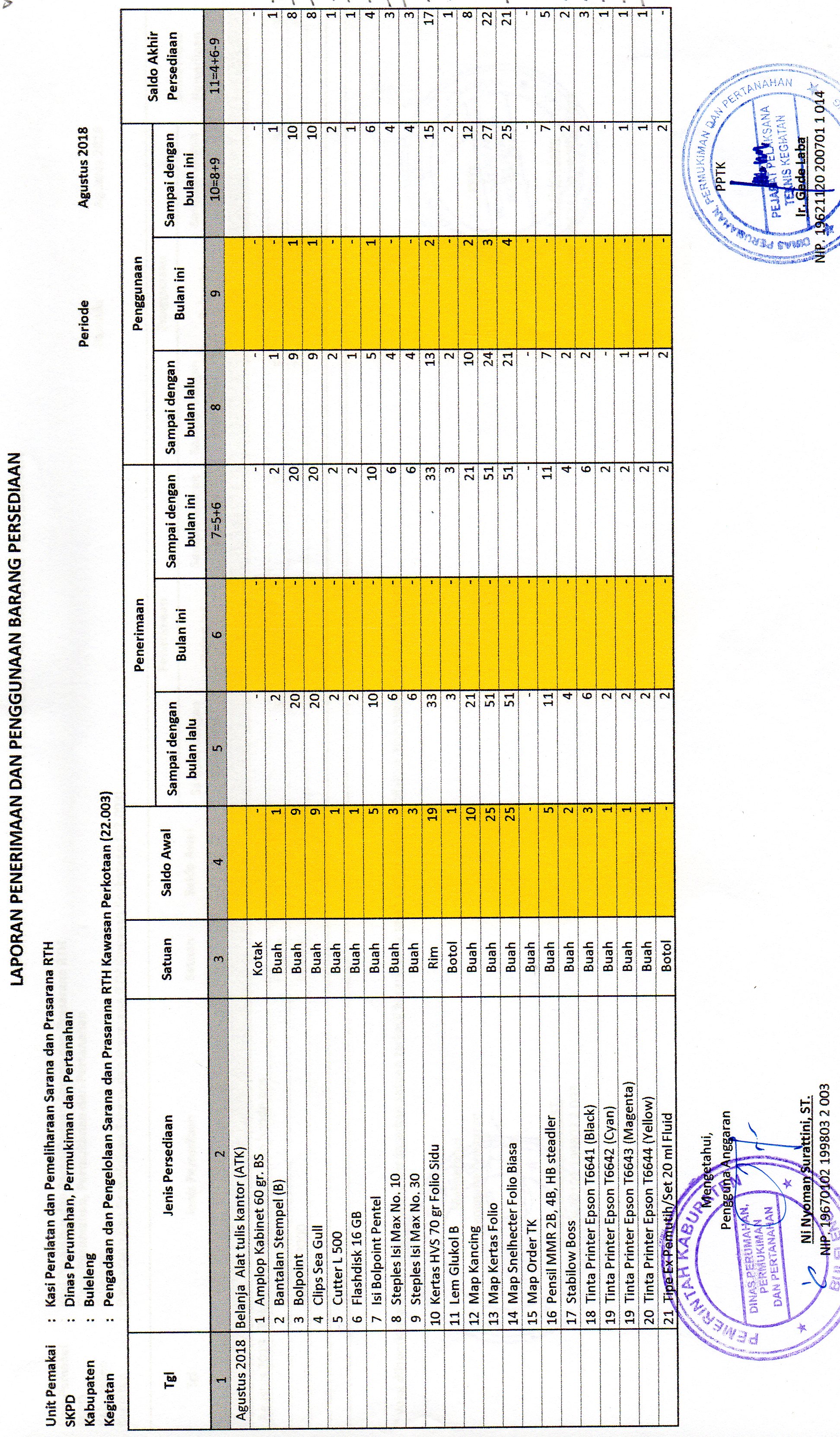 LAPORAN PENERIMAAN DAN PENGGUNAAN BARANG PERSEDIAAN ATK BULAN AGUSTUS BIDANG RTH (22.003)