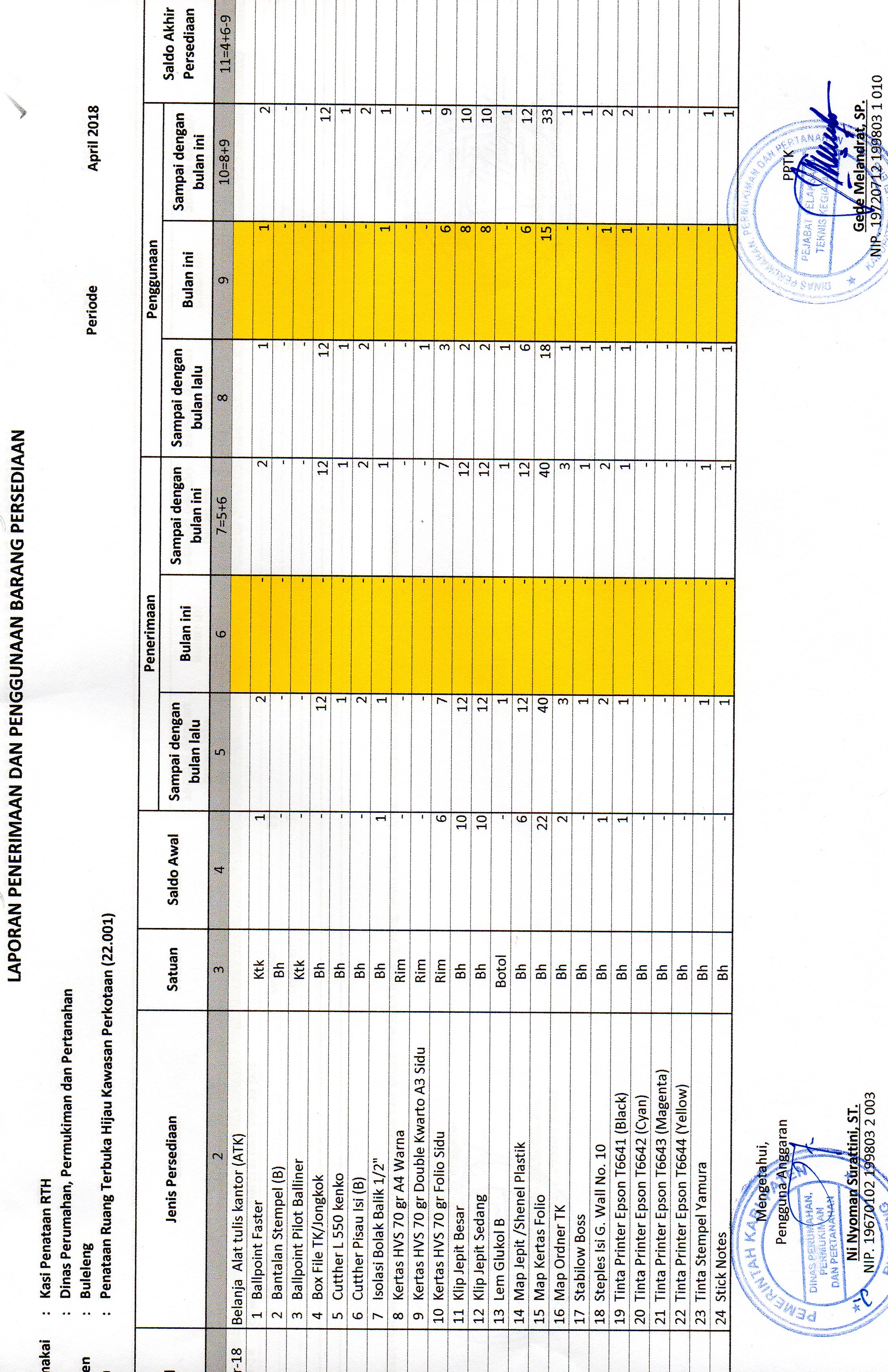 LAPORAN PENERIMAAN DAN PENGGUNAAN BARANG PERSEDIAAN ATK BULAN APRIL BIDANG RTH