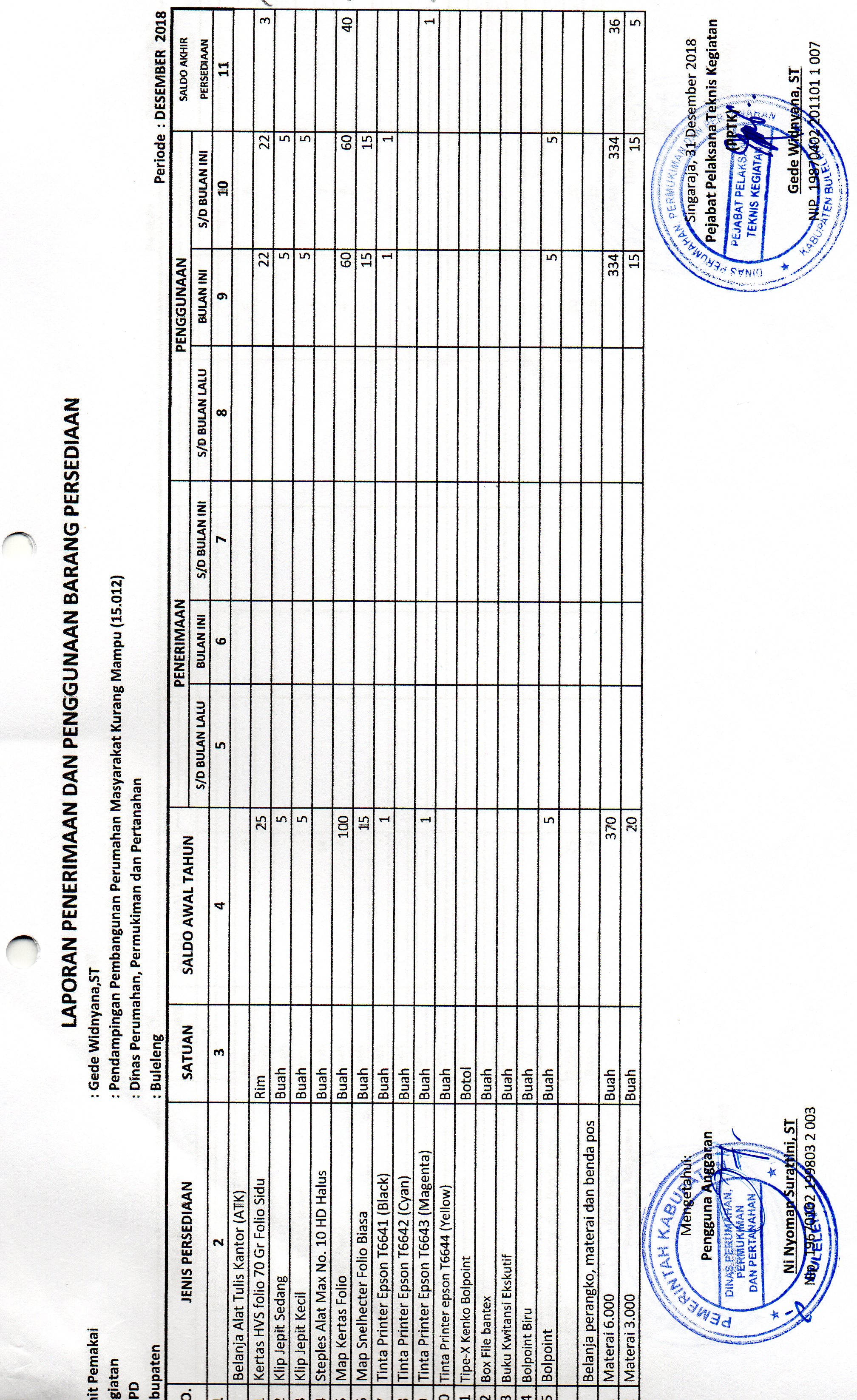 LAPORAN PENERIMAAN DAN PENGGUNAAN BARANG PERSEDIAAN ATK BULAN DESEMBER (15.012)