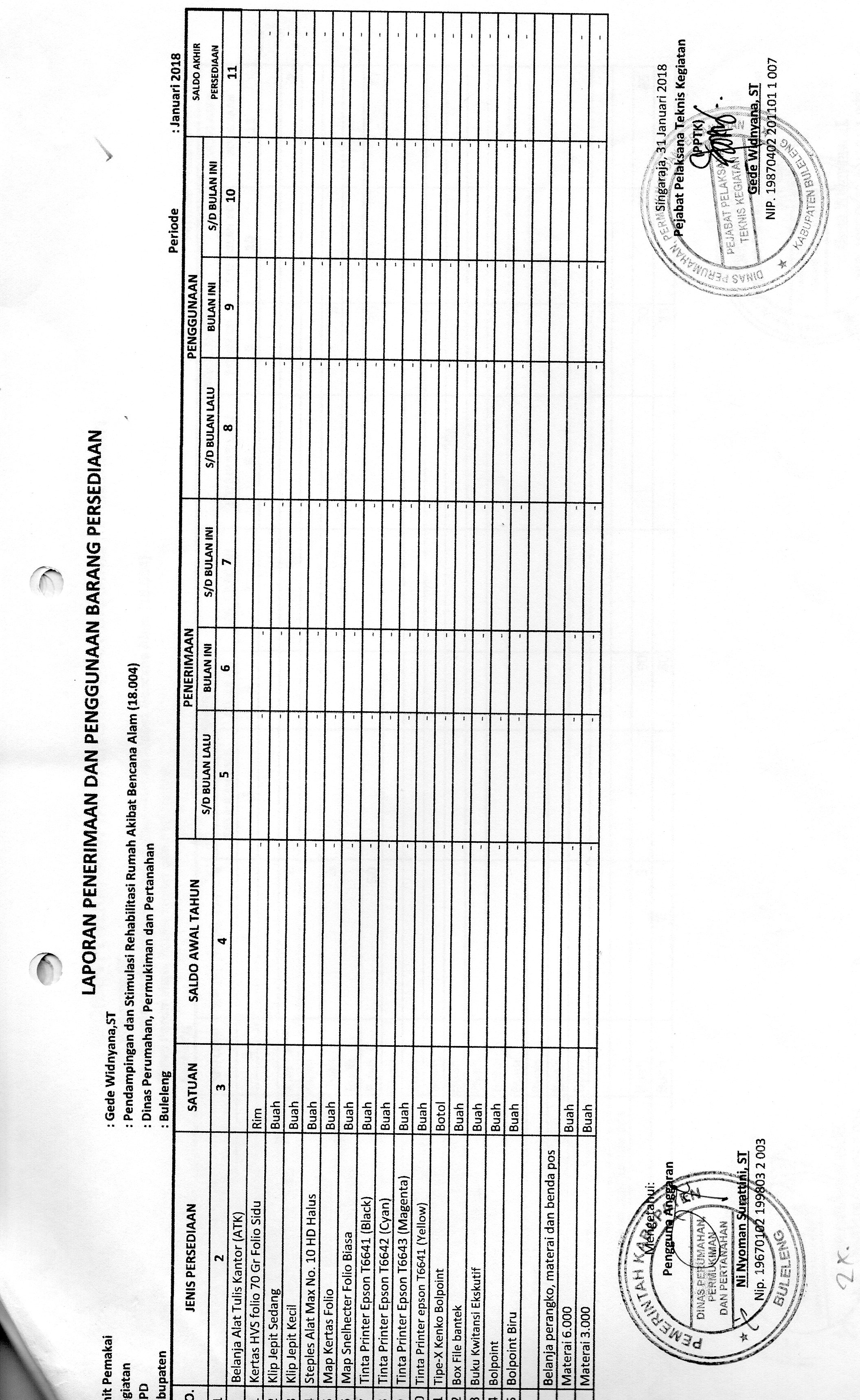 LAPORAN PENERIMAAN DAN PENGGUNAAN BARANG PERSEDIAAN ATK BULAN JANUARI BIDANG PERKIM (18.004)