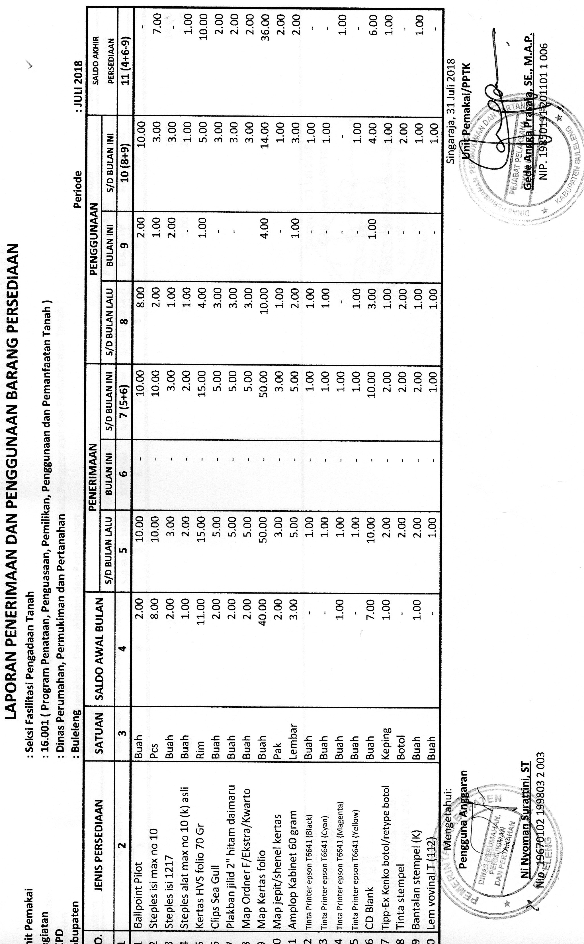 LAPORAN PENERIMAAN DAN PENGGUNAAN BARANG PERSEDIAAN ATK BULAN JULI