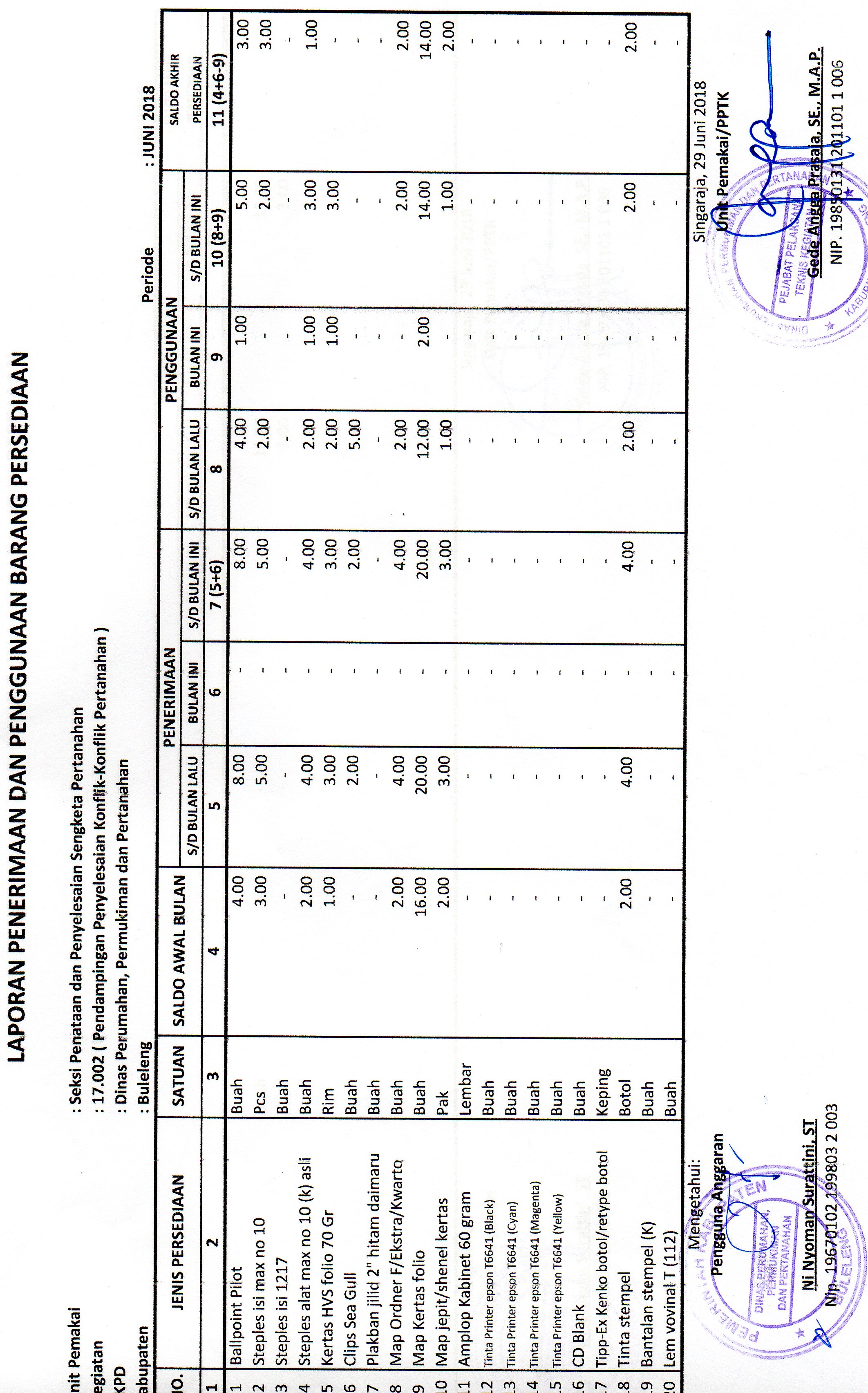 LAPORAN PENERIMAAN DAN PENGGUNAAN BARANG PERSEDIAAN ATK BULAN JUNI