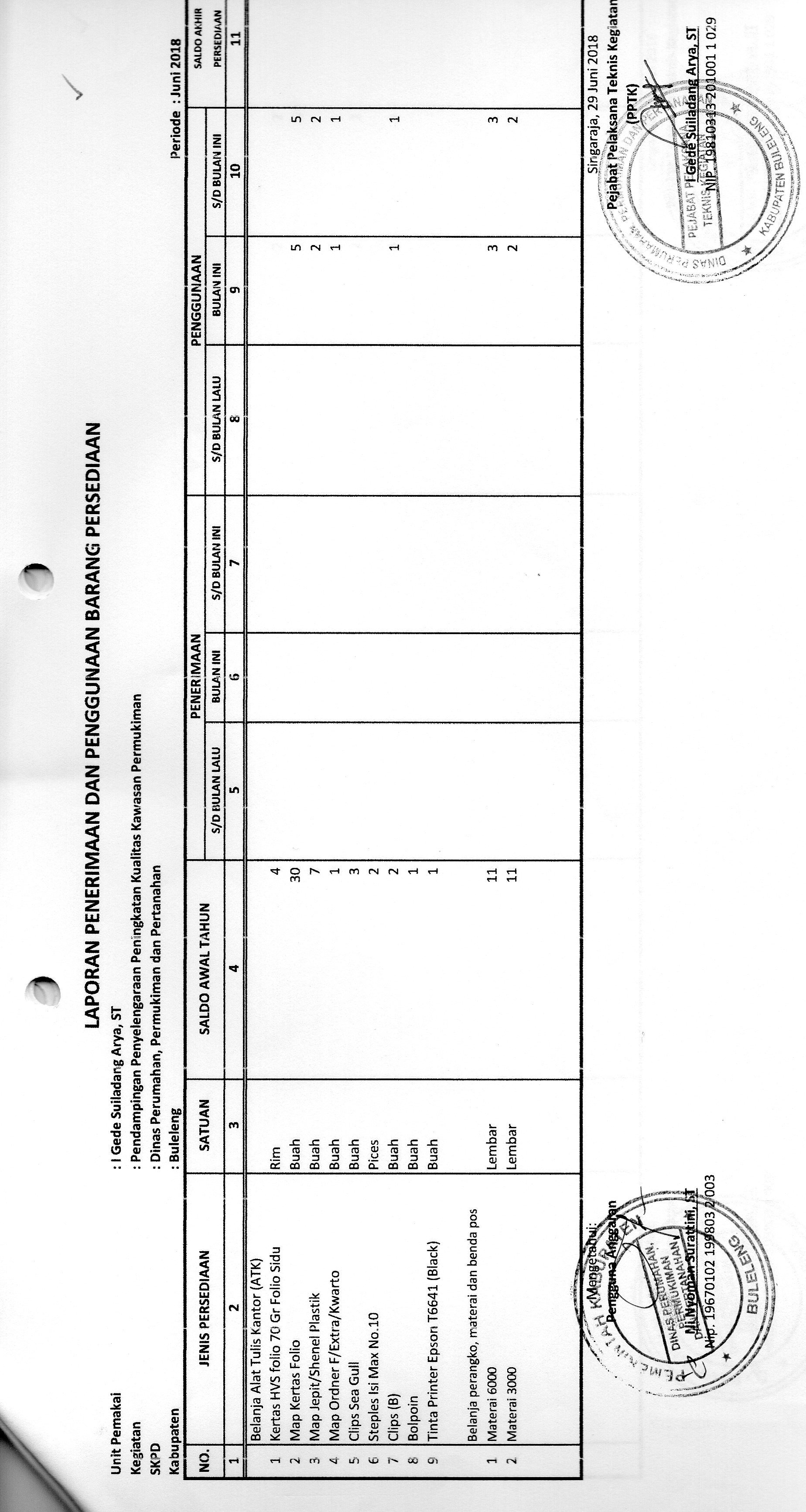 LAPORAN PENERIMAAN DAN PENGGUNAAN BARANG PERSEDIAAN ATK BULAN JUNI BIDANG PERKIM