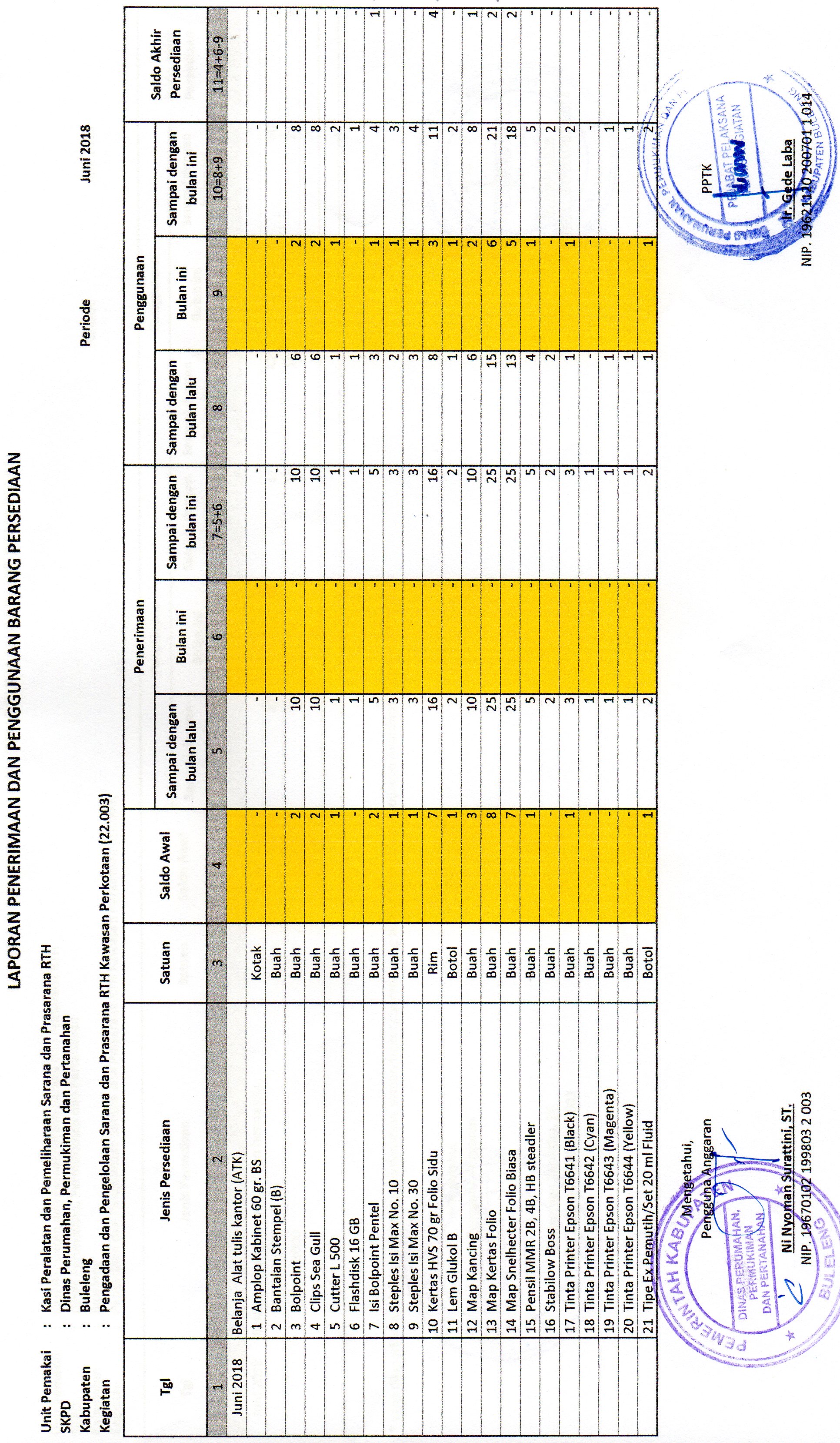 LAPORAN PENERIMAAN DAN PENGGUNAAN BARANG PERSEDIAAN ATK BULAN JUNI BIDANG RTH