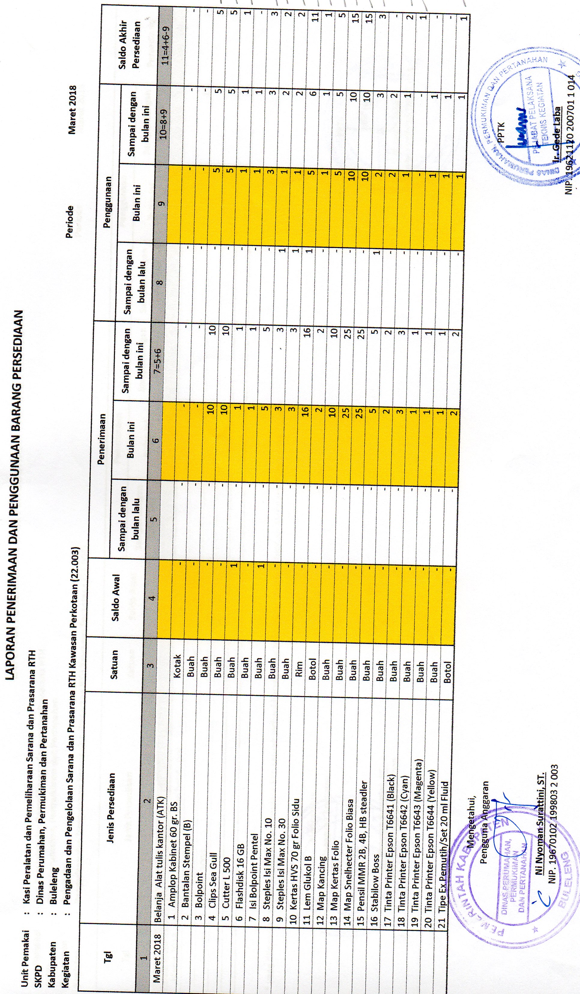 LAPORAN PENERIMAAN DAN PENGGUNAAN BARANG PERSEDIAAN ATK BULAN MARET BIDANG RTH