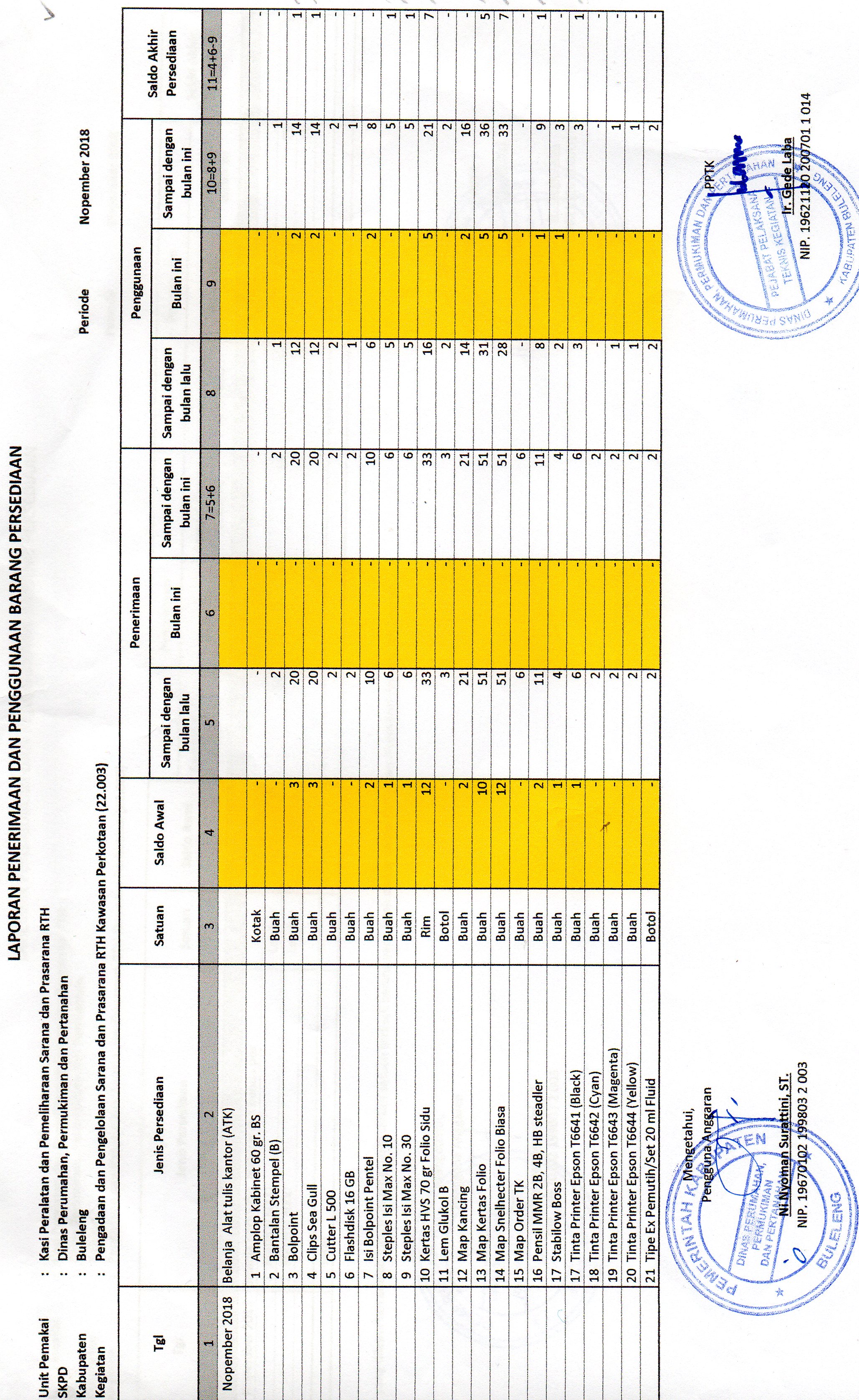 LAPORAN PENERIMAAN DAN PENGGUNAAN BARANG PERSEDIAAN ATK BULAN NOPEMBER BIDANG RTH