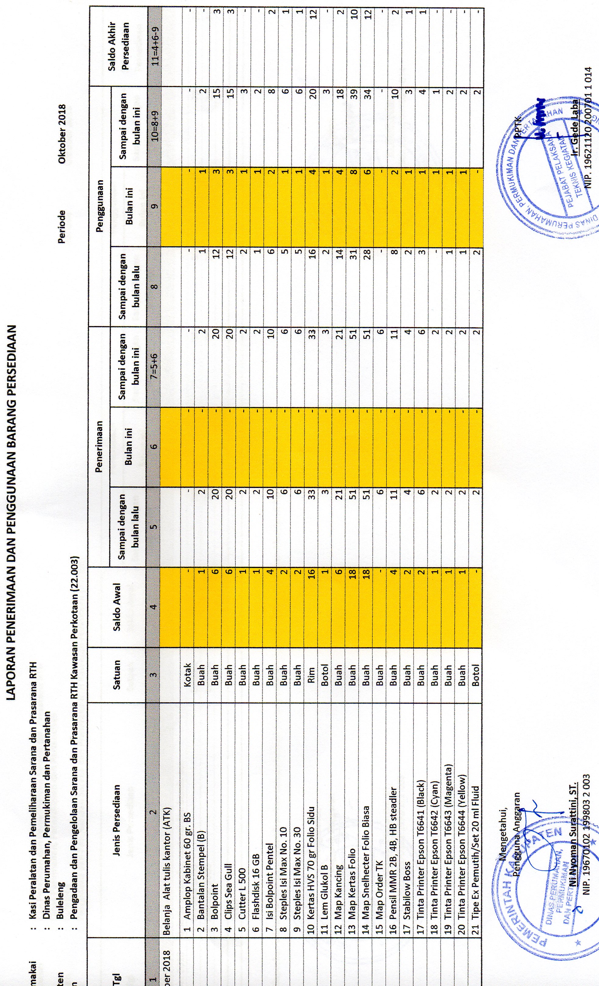 LAPORAN PENERIMAAN DAN PENGGUNAAN BARANG PERSEDIAAN ATK BULAN OKTOBER BIDANG RTH