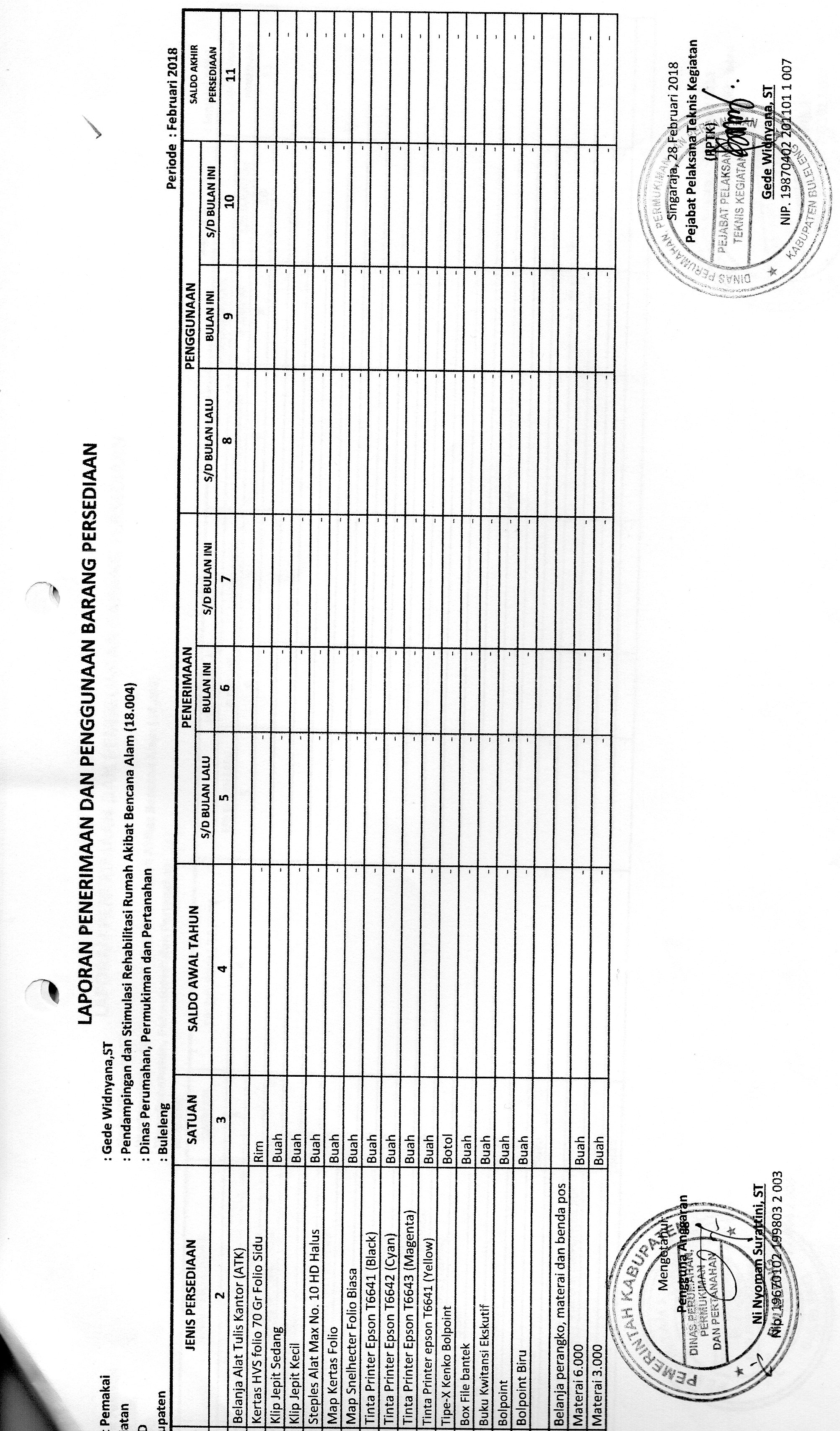 LAPORAN PENERIMAAN DAN PENGGUNAAN BARANG PERSEDIAAN ATK BULAN PEBRUARI BIDANG PERKIM
