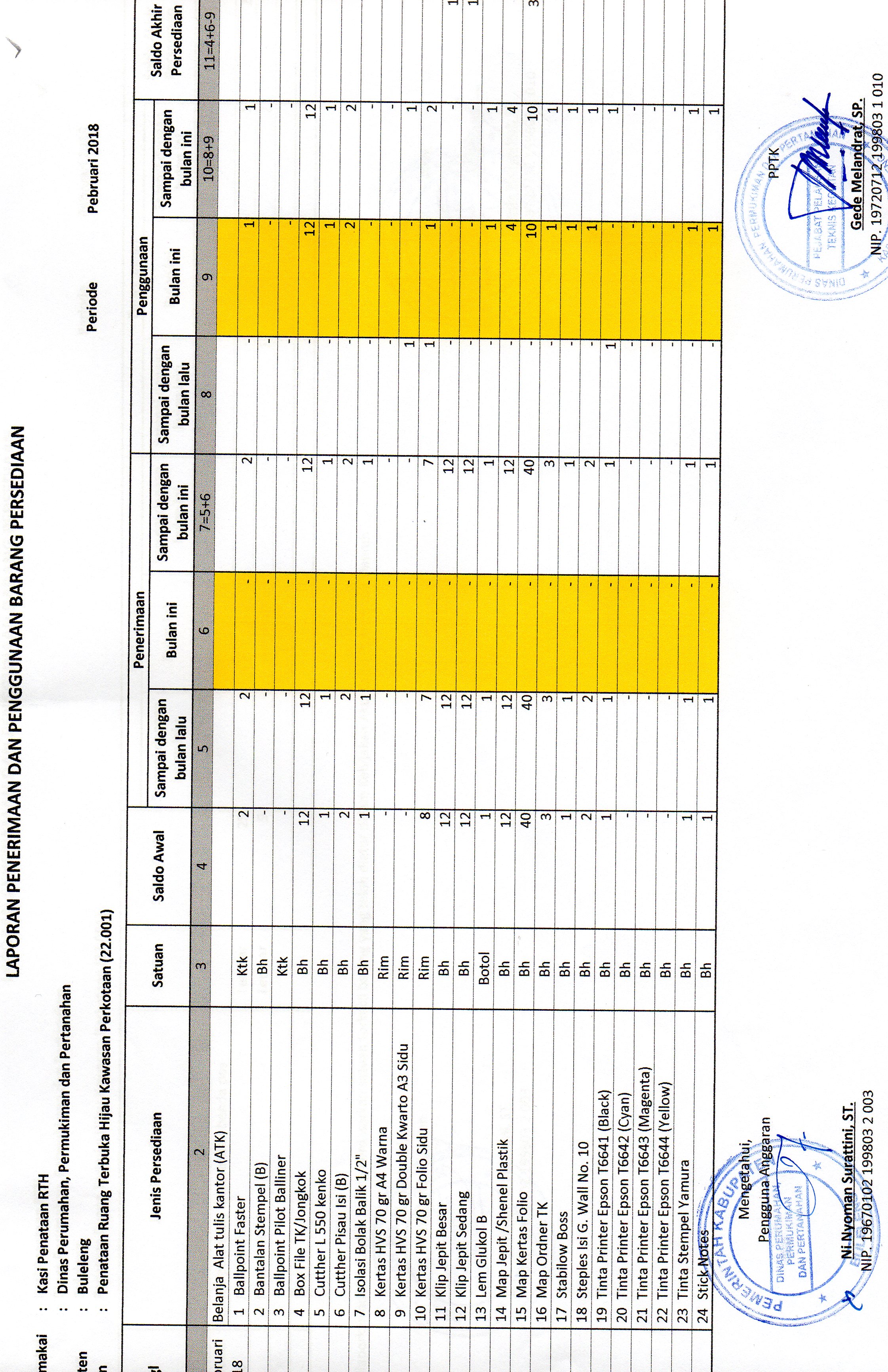LAPORAN PENERIMAAN DAN PENGGUNAAN BARANG PERSEDIAAN ATK BULAN PEBRUARI BIDANG RTH (22.001)