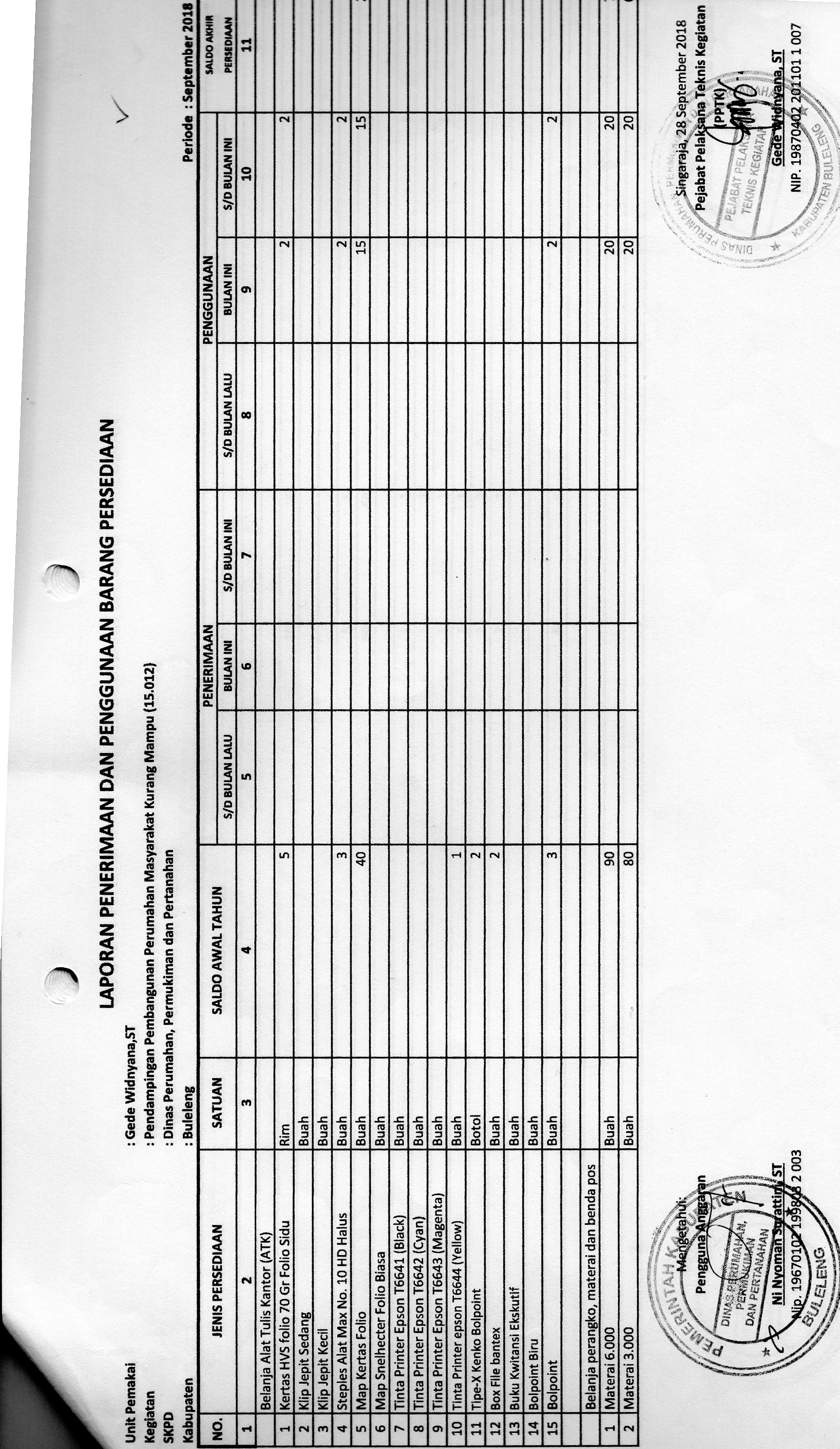 LAPORAN PENERIMAAN DAN PENGGUNAAN BARANG PERSEDIAAN ATK BULAN SEPTEMBER BIDANG PERKIM (15.012)