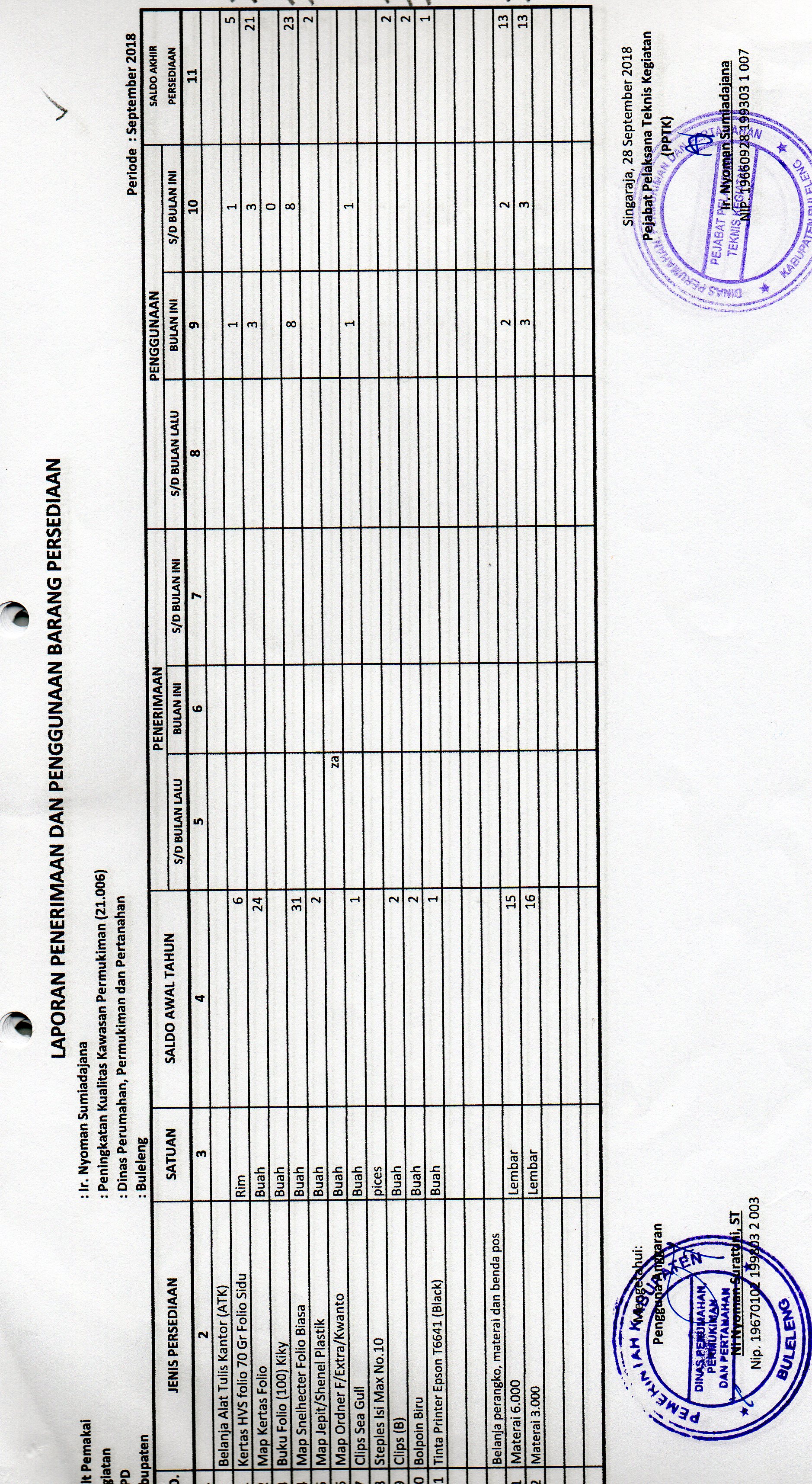 LAPORAN PENERIMAAN DAN PENGGUNAAN BARANG PERSEDIAAN ATK BULAN SEPTEMBER BIDANG PERKIM