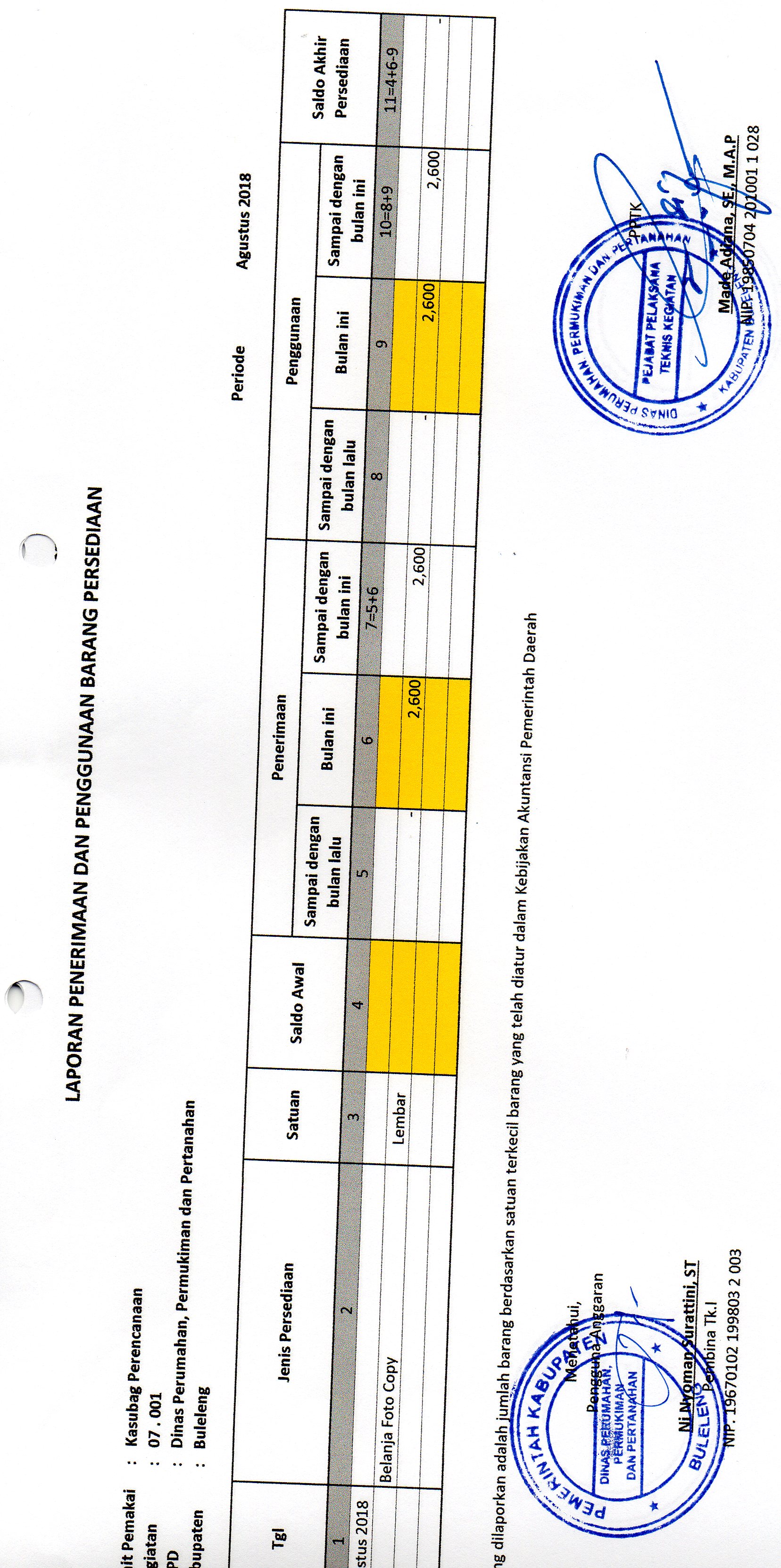 LAPORAN PENERIMAAN DAN PENGGUNAAN BARANG PERSEDIAAN BELANJA FOTO COPY BULAN AGUSTUS BIDANG PEENCANAAN