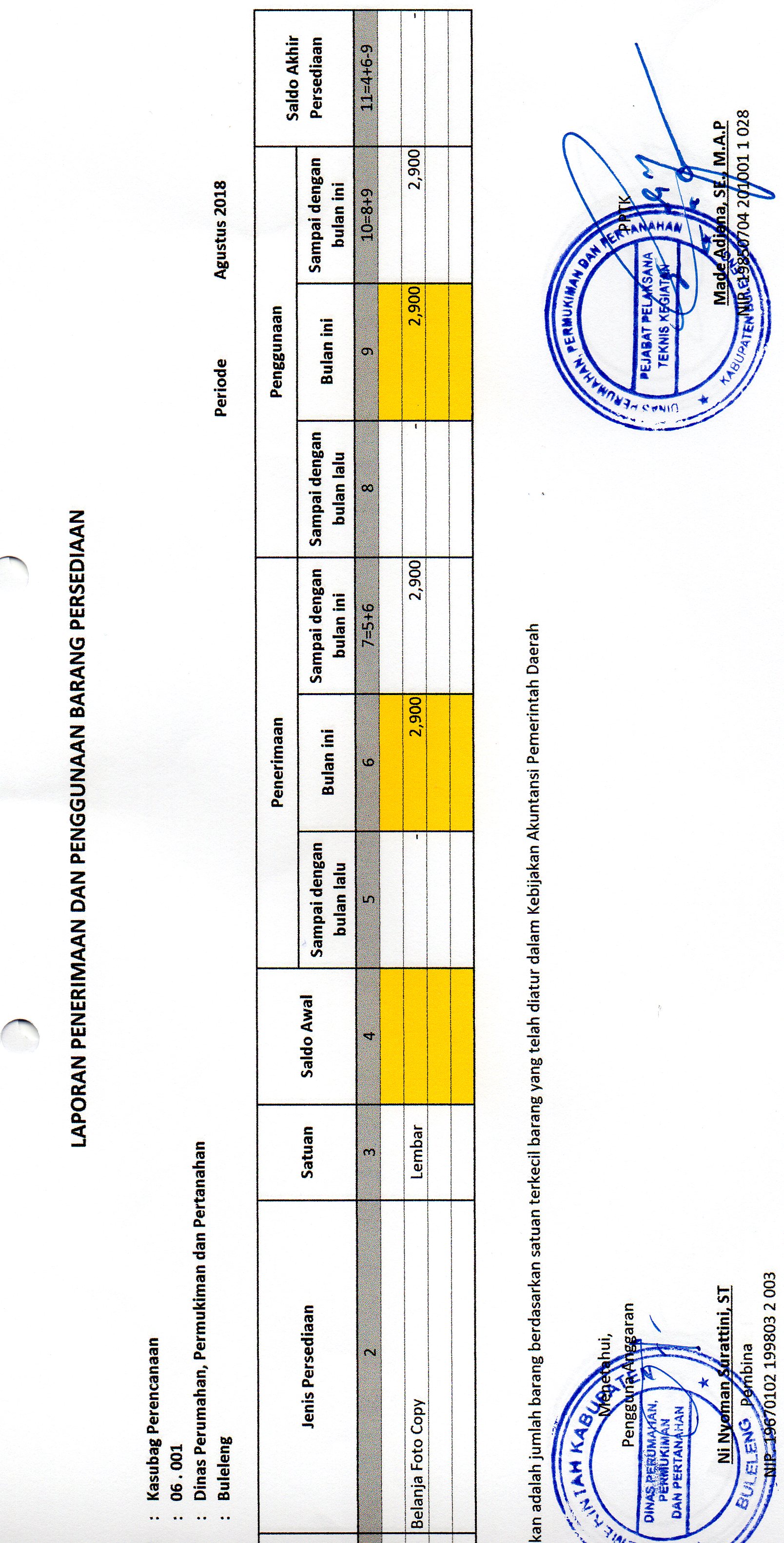 LAPORAN PENERIMAAN DAN PENGGUNAAN BARANG PERSEDIAAN BELANJA FOTO COPY BULAN AGUSTUS BIDANG PEENCANAAN