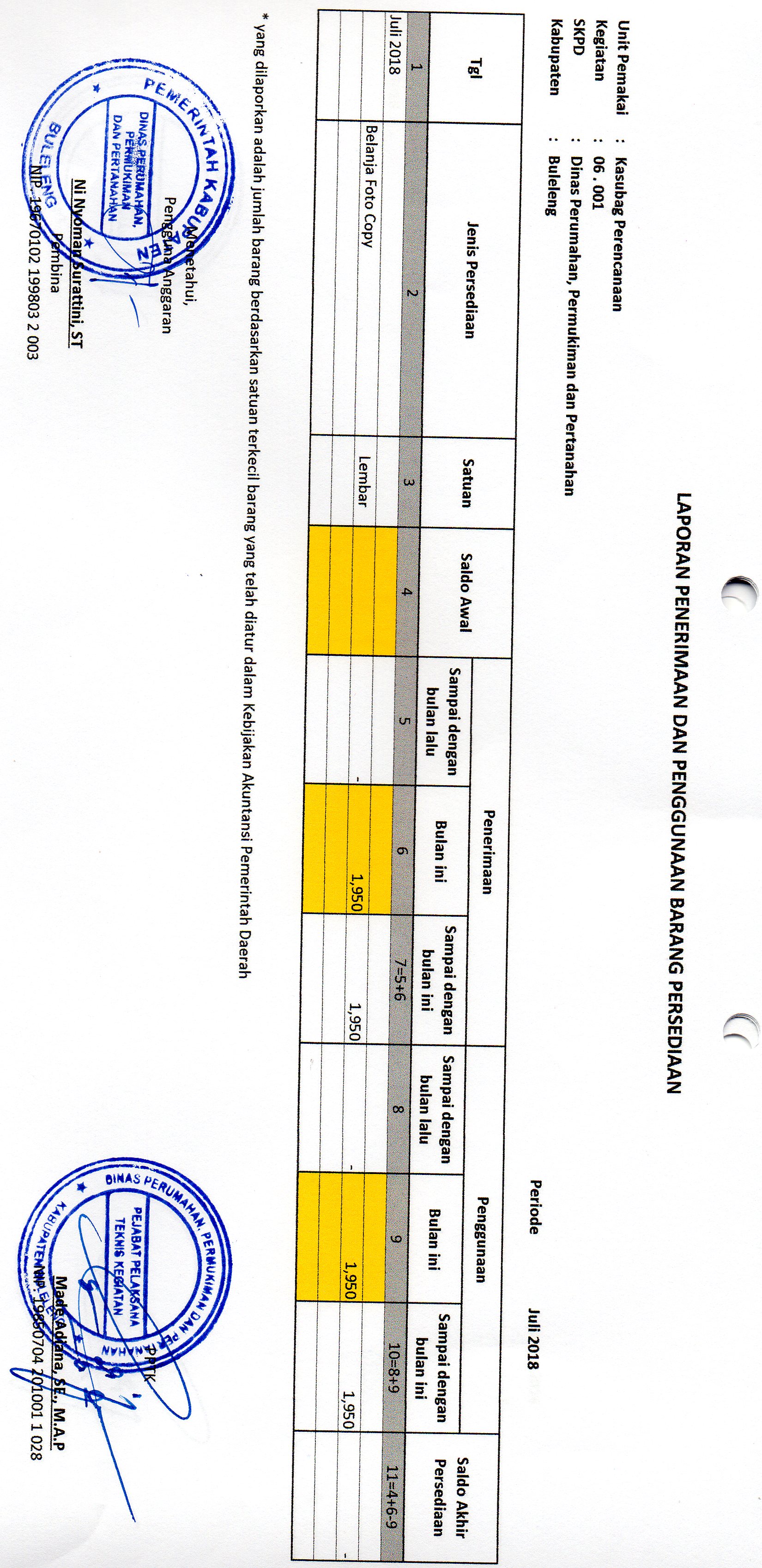 LAPORAN PENERIMAAN DAN PENGGUNAAN BARANG PERSEDIAAN BELANJA FOTO COPY BULAN JULI BIDANG PEENCANAAN