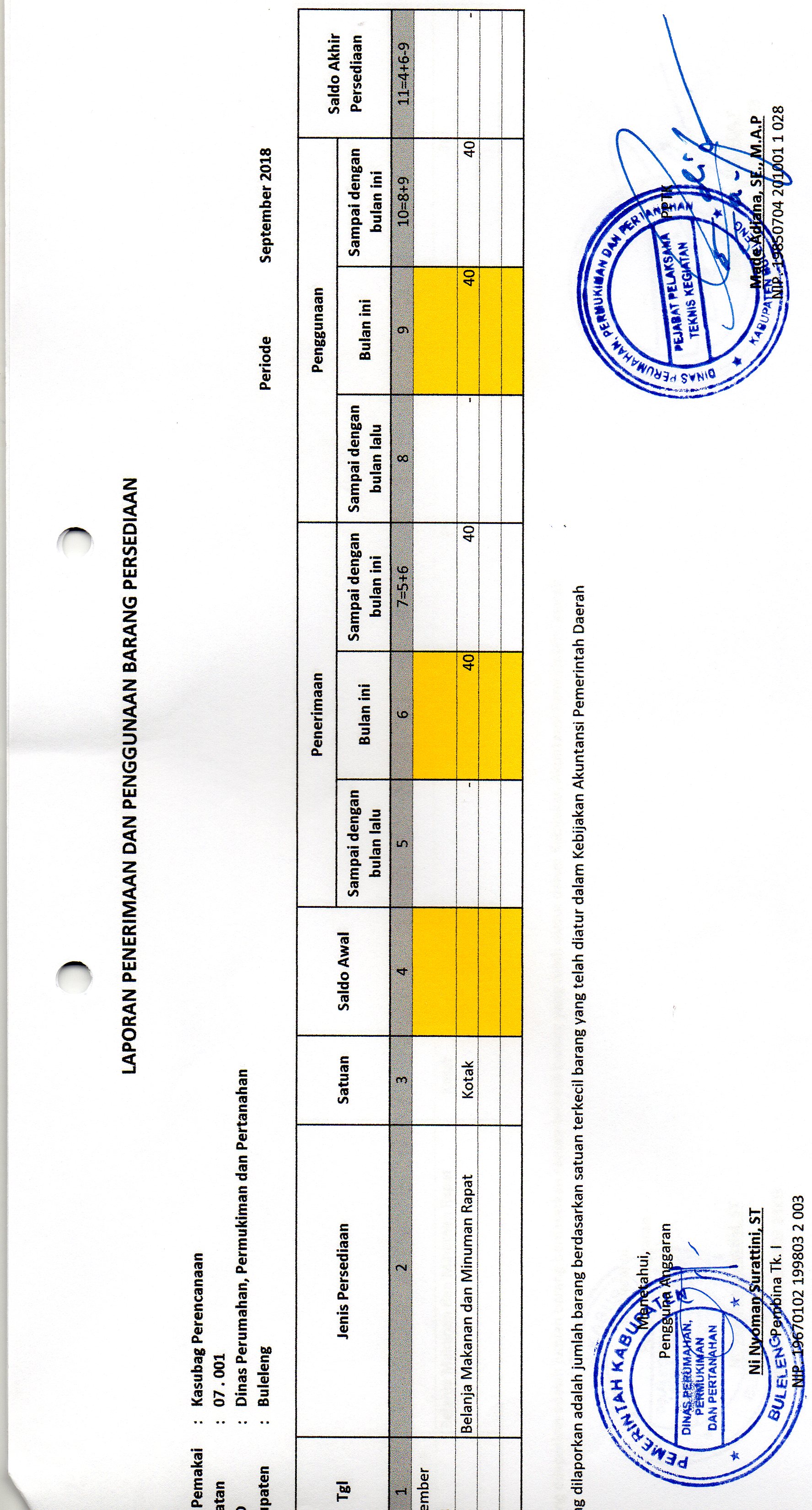 LAPORAN PENERIMAAN DAN PENGGUNAAN BARANG PERSEDIAAN MAKMIN BULAN SEPTEMBER BIDANG PERENCANAAN