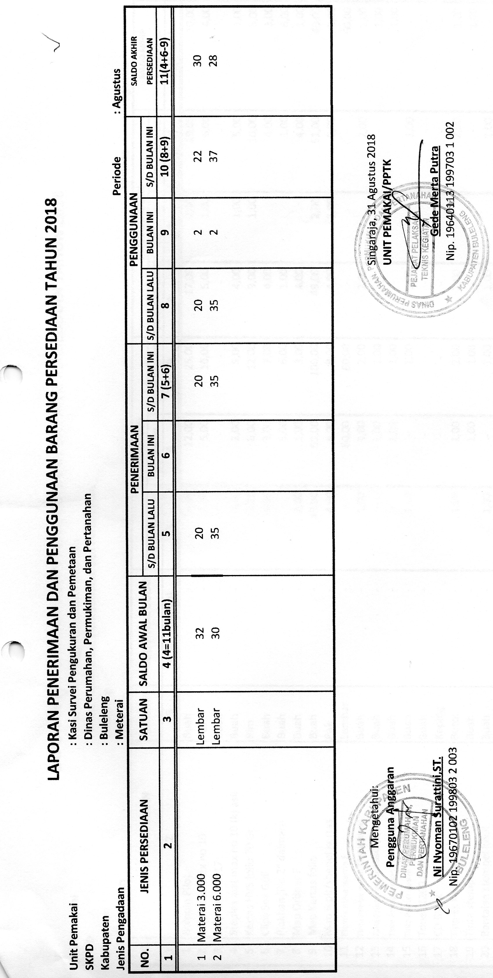 LAPORAN PENERIMAAN DAN PENGGUNAAN BARANG PERSEDIAAN MATERAI BULAN AGUSTUS