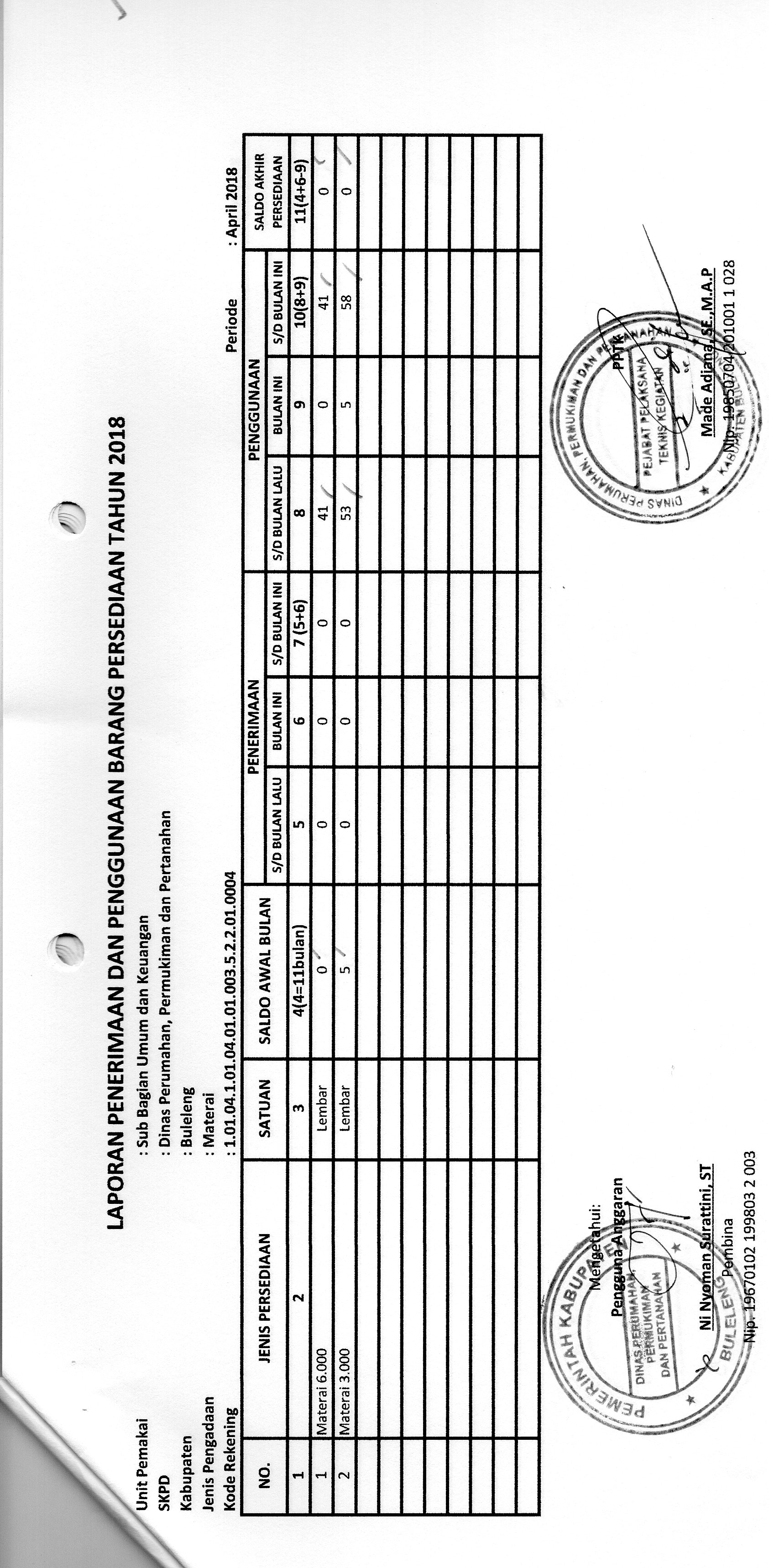 LAPORAN PENERIMAAN DAN PENGGUNAAN BARANG PERSEDIAAN MATERAI BULAN APRIL BIDANG UMUM DAN KEUANGAN ( 01.003)