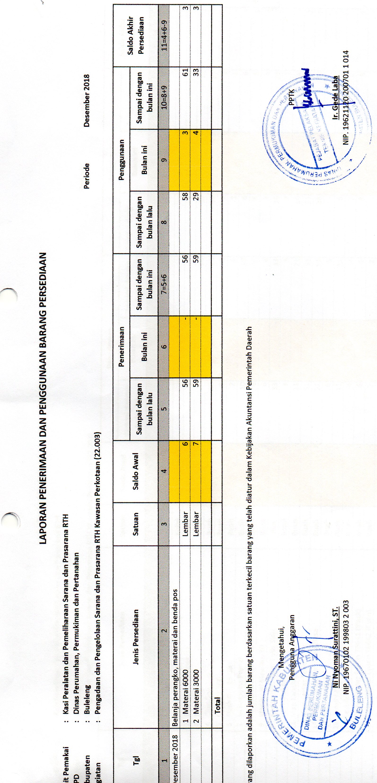 LAPORAN PENERIMAAN DAN PENGGUNAAN BARANG PERSEDIAAN MATERAI BULAN DESEMBER BIDANG RTH