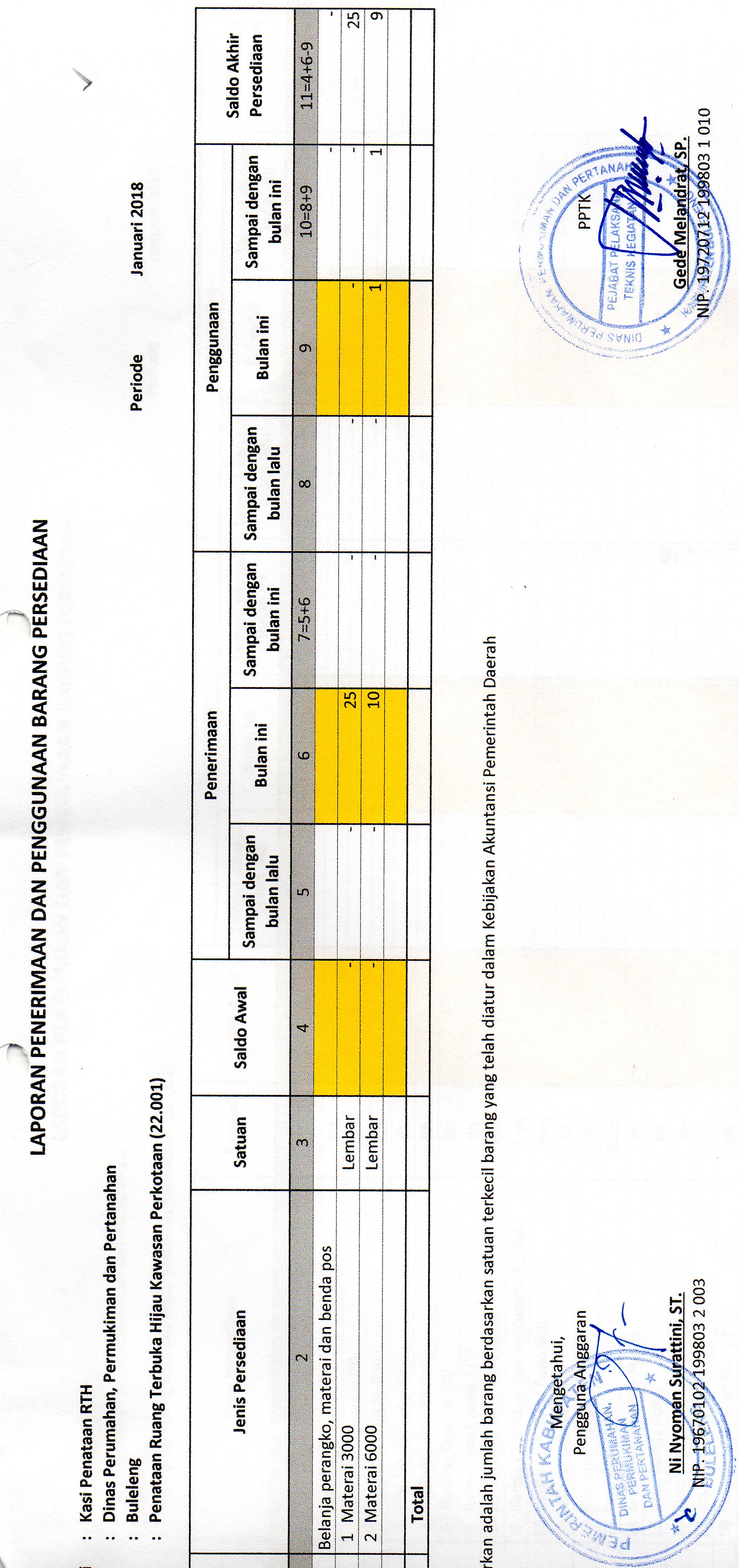 LAPORAN PENERIMAAN DAN PENGGUNAAN BARANG PERSEDIAAN MATERAI BULAN JANUARI BIDANG RTH (22.001)