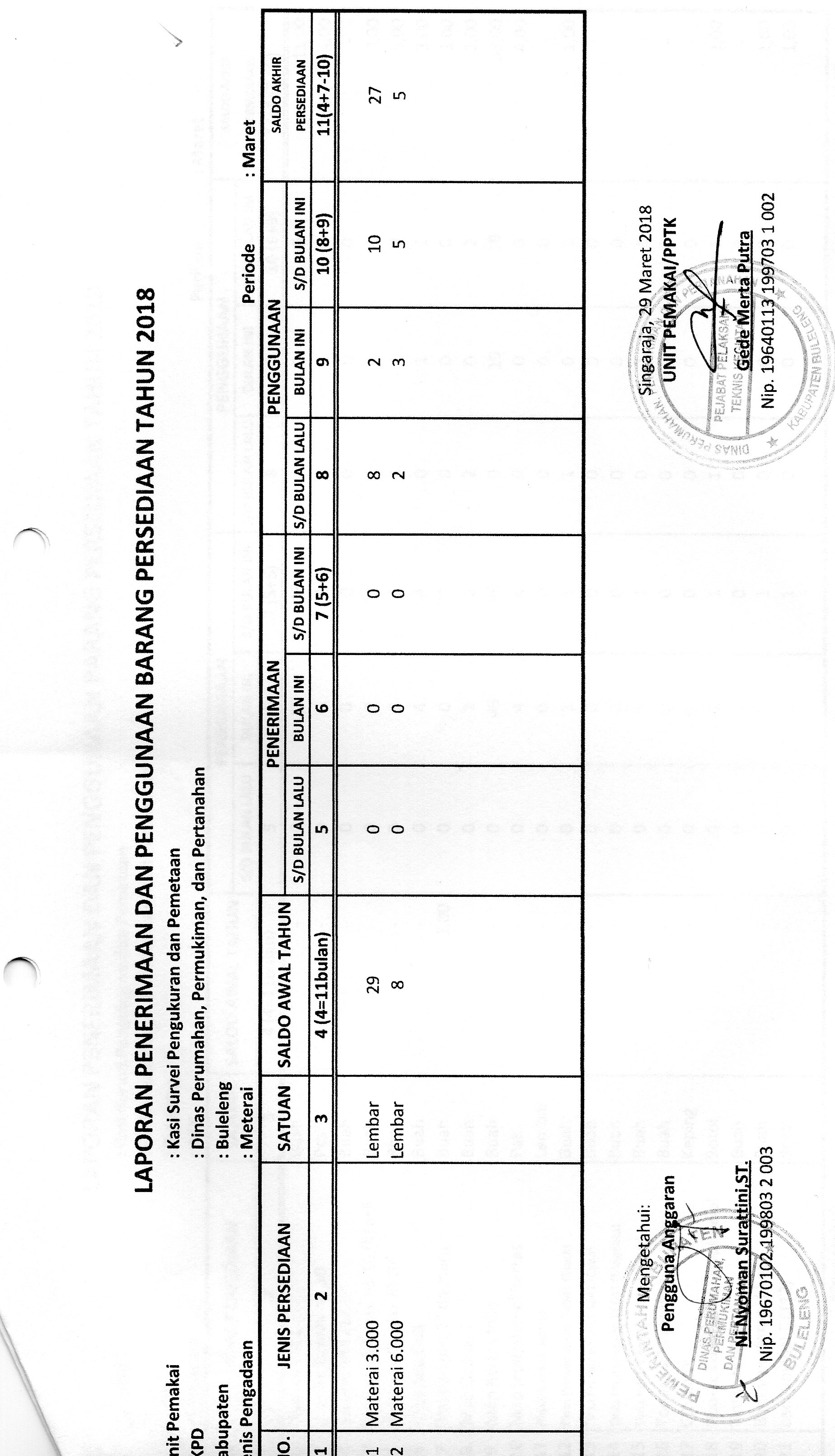 LAPORAN PENERIMAAN DAN PENGGUNAAN BARANG PERSEDIAAN MATERAI BULAN MARET