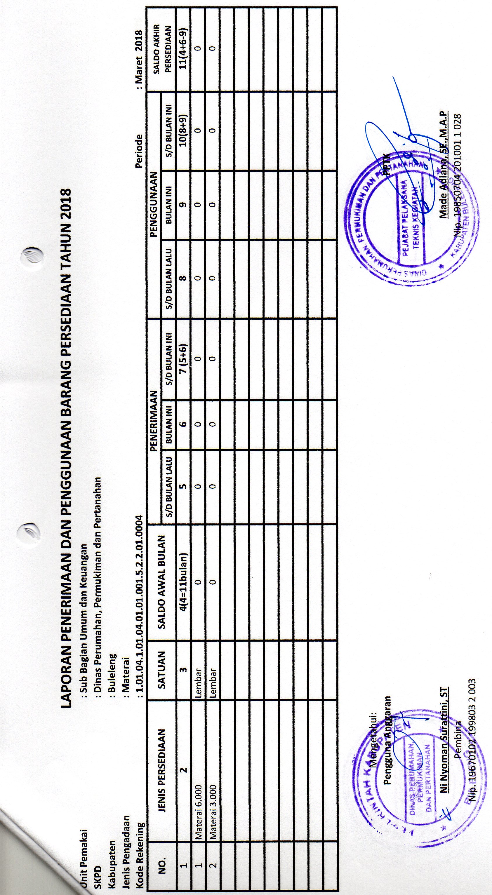 LAPORAN PENERIMAAN DAN PENGGUNAAN BARANG PERSEDIAAN MATERAI BULAN MARET BIDANG UMUM DAN KEUANGAN (01.001)
