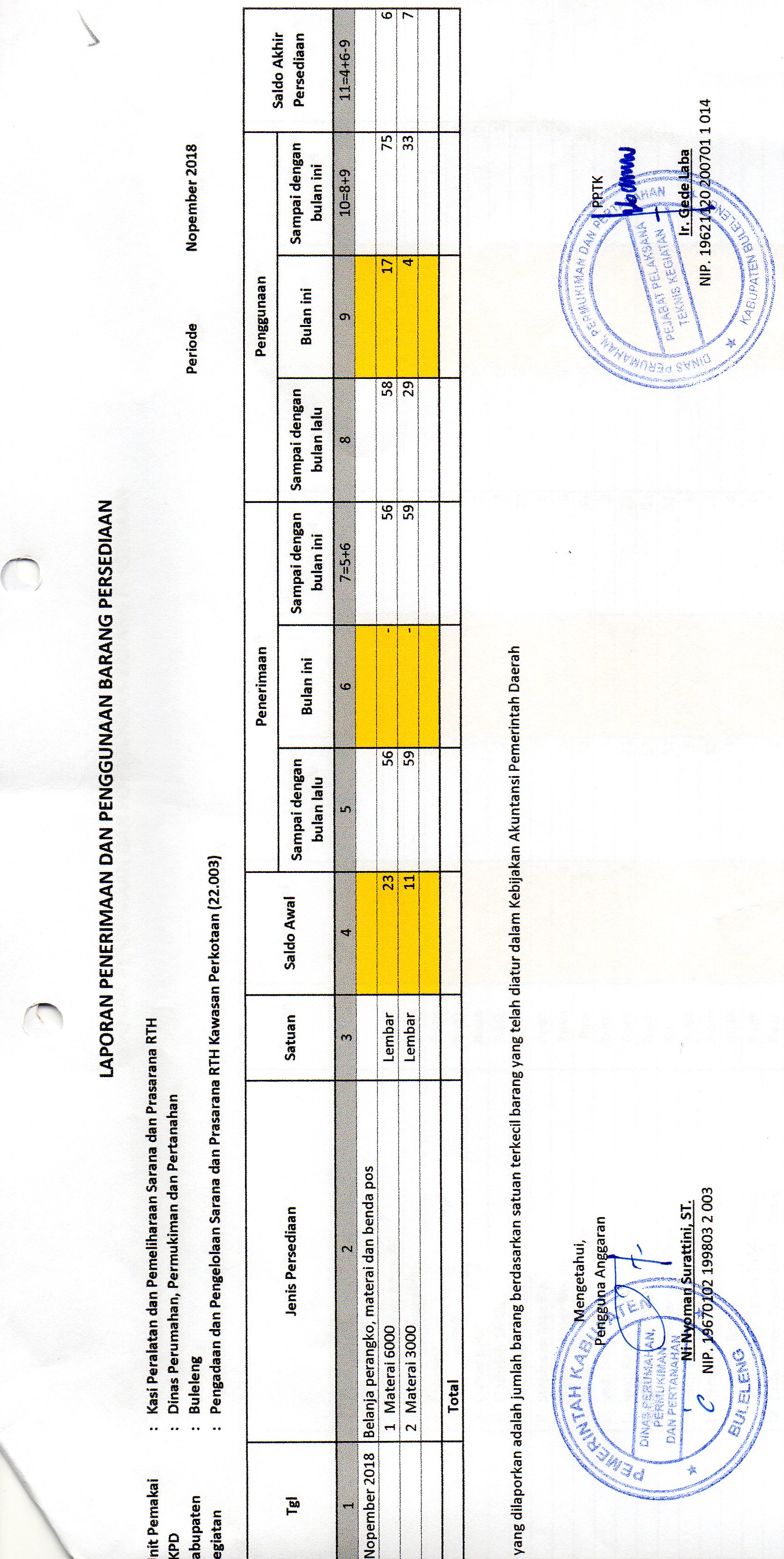 LAPORAN PENERIMAAN DAN PENGGUNAAN BARANG PERSEDIAAN MATERAI BULAN NOPEMBER BIDANG RTH