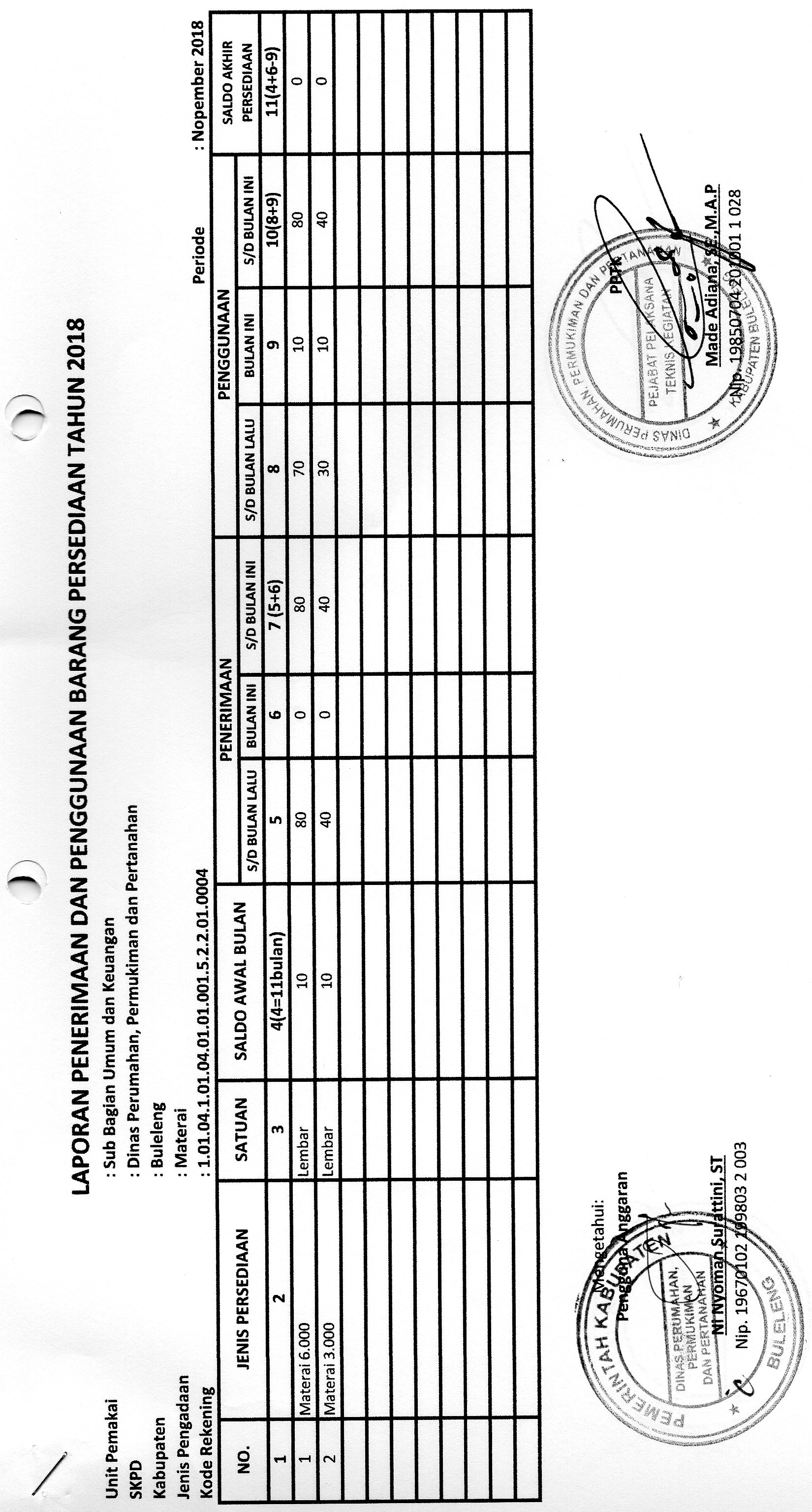 LAPORAN PENERIMAAN DAN PENGGUNAAN BARANG PERSEDIAAN MATERAI BULAN NOPEMBER BIDANG UMUM DAN KEUANGAN (01.001)