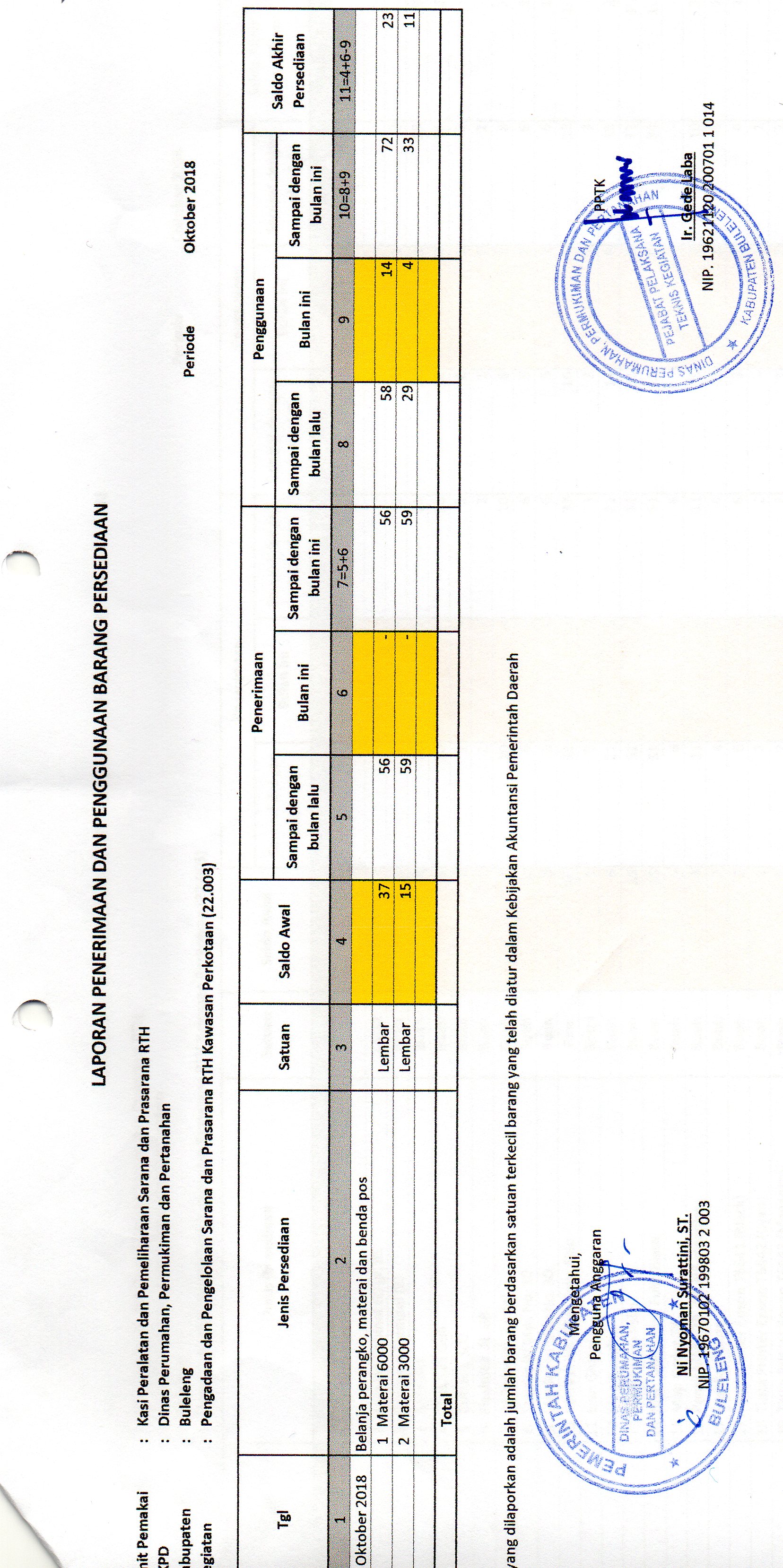LAPORAN PENERIMAAN DAN PENGGUNAAN BARANG PERSEDIAAN MATERAI BULAN OKTOBER BIDANG RTH (22.003)