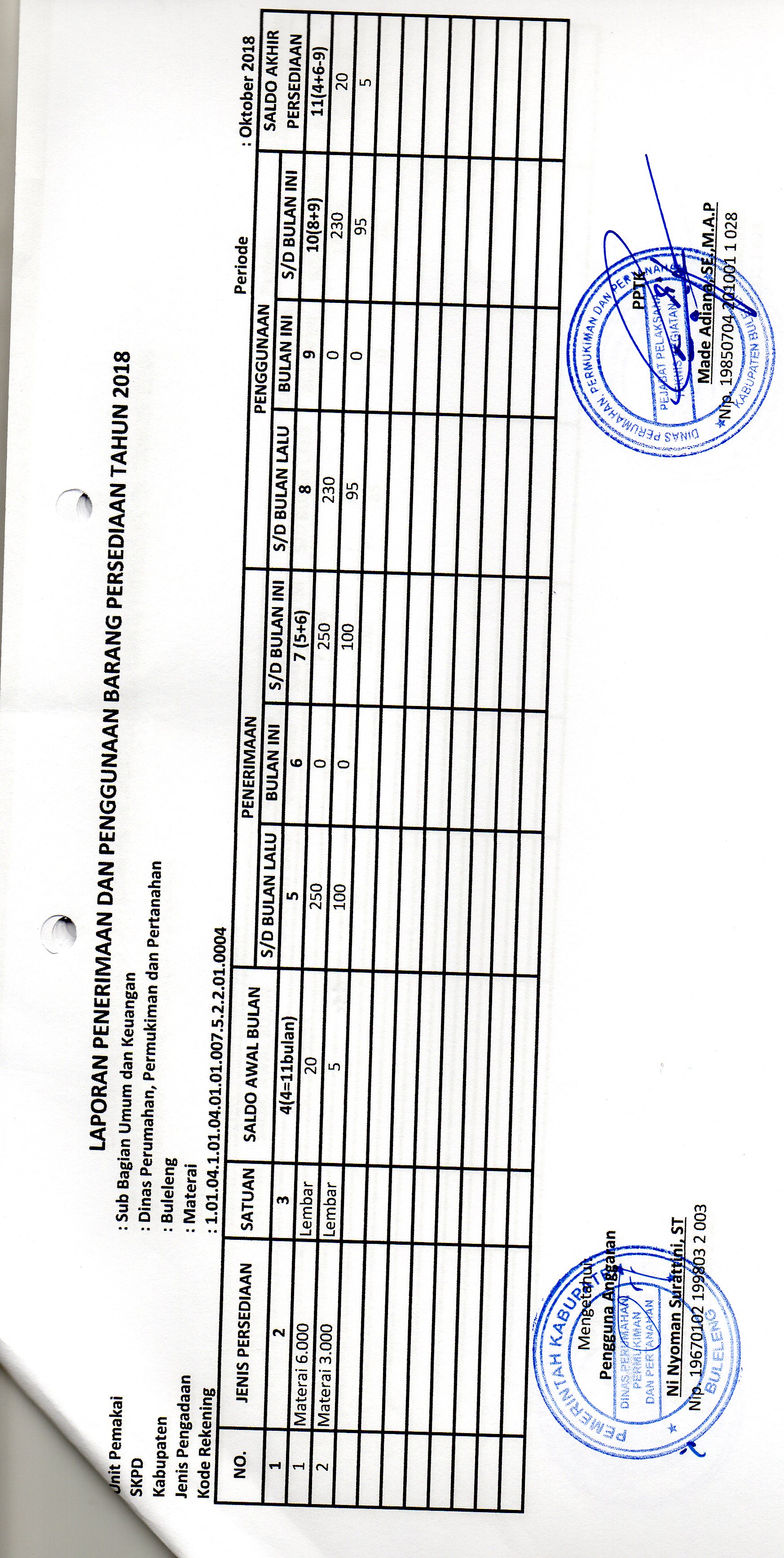 LAPORAN PENERIMAAN DAN PENGGUNAAN BARANG PERSEDIAAN MATERAI BULAN OKTOBER BIDANG UMUM DAN KEUANGAN (01.007)