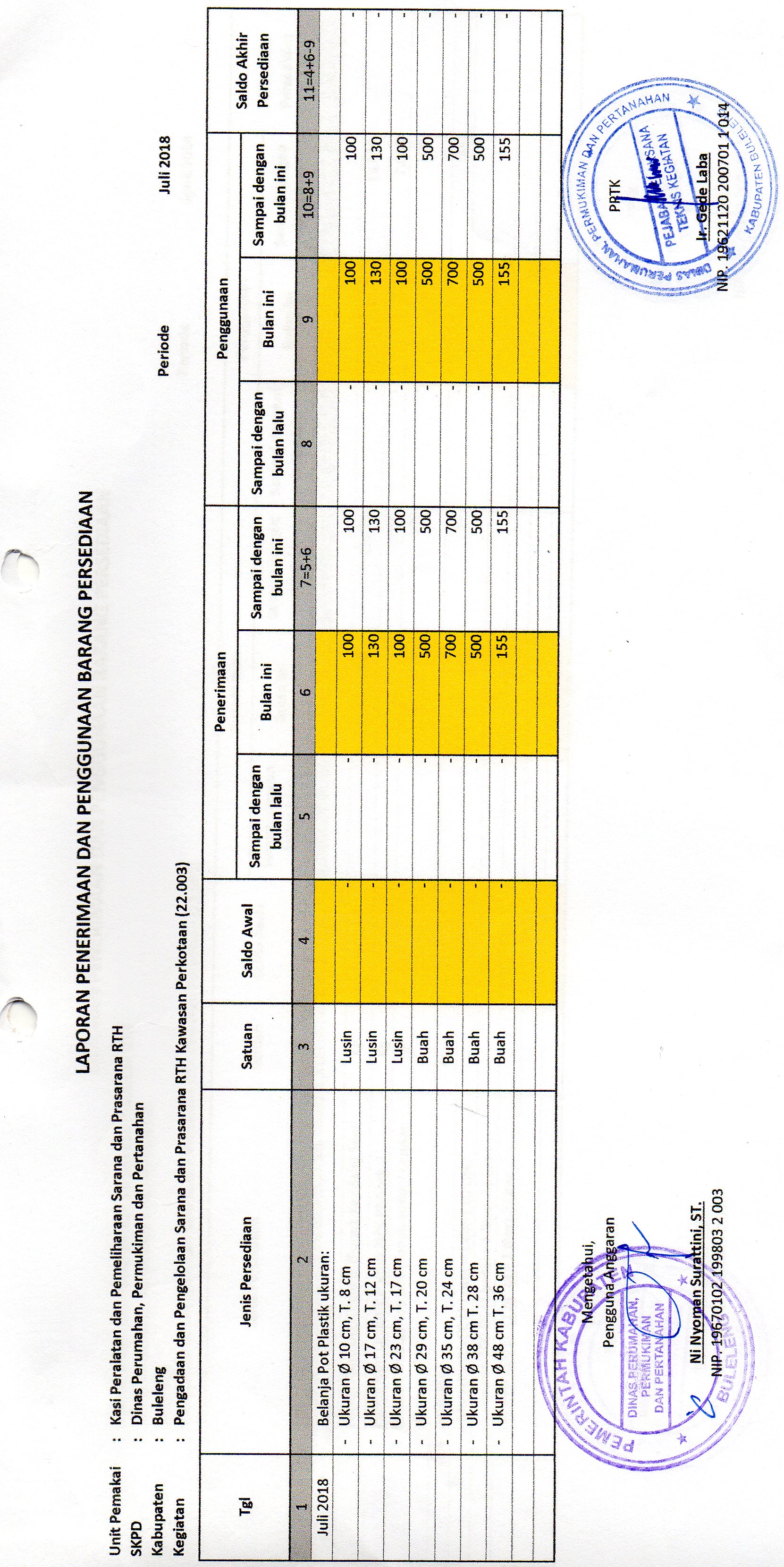 LAPORAN PENERIMAAN DAN PENGGUNAAN BARANG PERSEDIAAN POT PLASTIK BULAN JULI BIDANG RTH