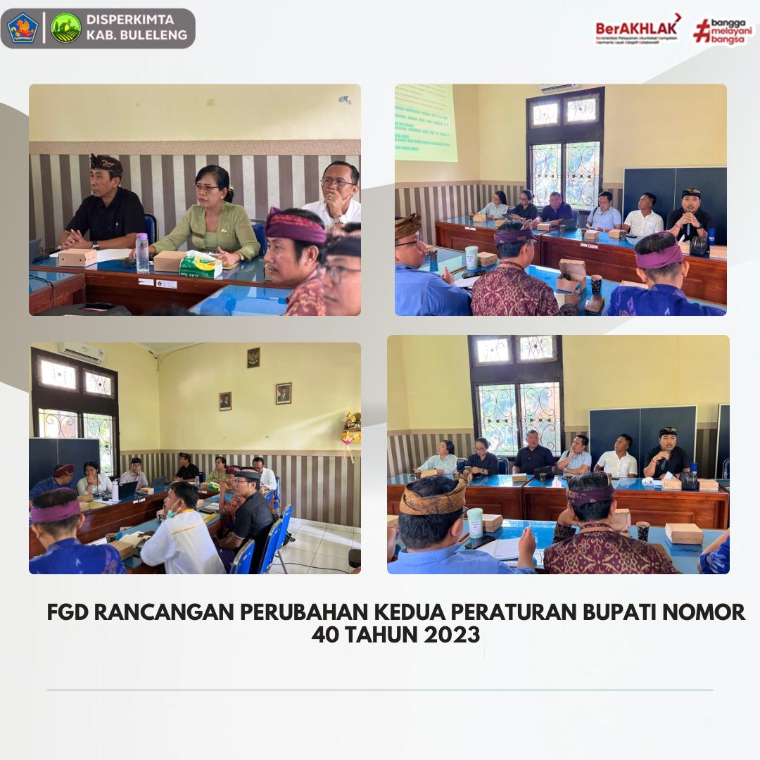 Kamis, 20 Februari 2025, telah dilaksanakan Forum Group Discussion (FGD) mengenai Rancangan Perubahan Kedua atas Peraturan Bupati Nomor 40 Tahun 2023, yang mengubah Pasal 8 ayat (3) dan Pasal 8 ayat (4). FGD ini dihadiri oleh para undangan sesuai daftar hadir dan bertempat di Ruang Rapat Kantor Dinas Perumahan, Kawasan Permukiman, dan Pertanahan Kabupaten Buleleng.