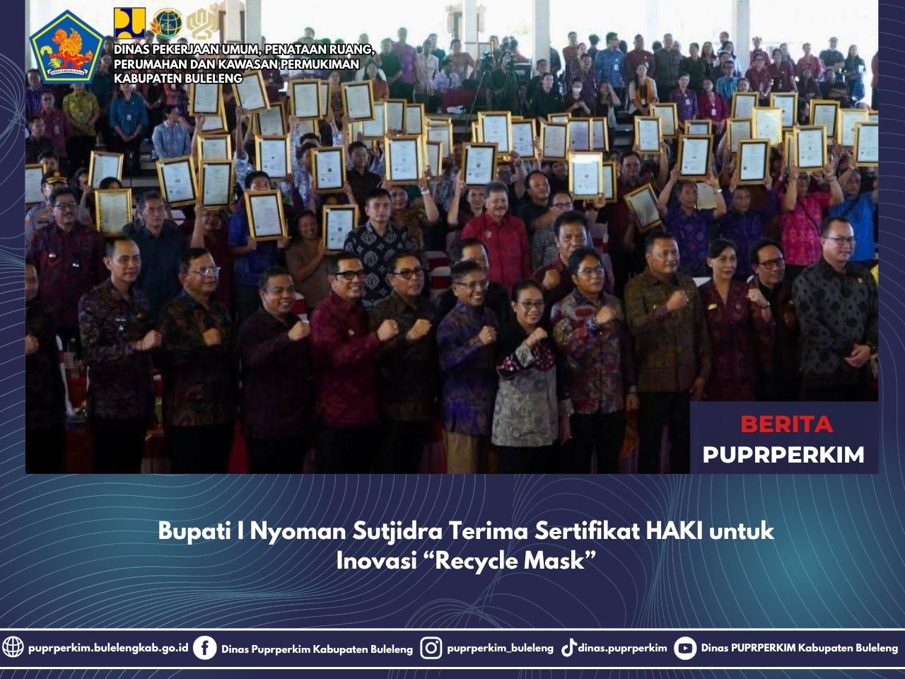 Sertifikat HAKI ini diberikan untuk karya berjudul “Recycle Mask”, yang merupakan hasil kreativitas masyarakat Buleleng dalam mengolah limbah sampah plastik menjadi produk seni yang memiliki nilai guna sekaligus estetika.