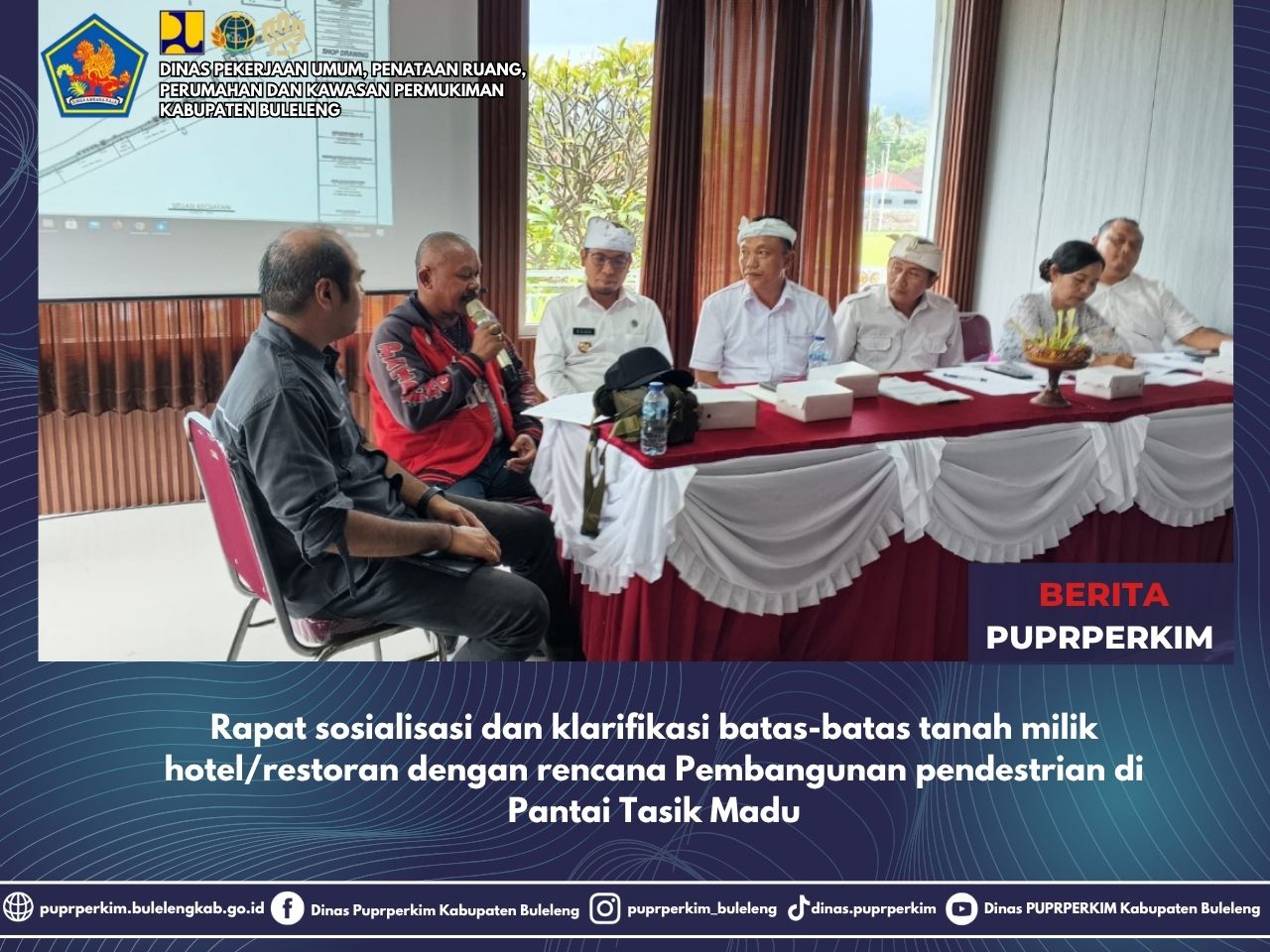 Mewakili Kepala Dinas PUPRPERKIM, Kepala Bidang Cipta Karya menyampaikan dibeberapa titik Lokasi pendestrian memerlukan klarifikasi batas lahan dengan pemilik hotel agar pembangunan pendestrian dapat terealisasi sesuai rencana dan menjadi daya tarik pendukung kebangkitan Kawasan Lovina. Para pemilik tanah/ahli waris maupun perwakilan yang hadir sepakat menyesuaikan batas-batas bagunan hotel/restoran sesuai sertifikat yang dimiliki untuk mendukung kegiatan Penataan Infrastruktur Kawasan Wisata Lovina.