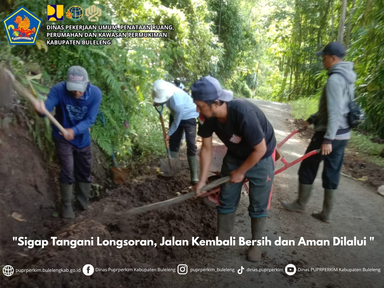 Kegiatan pembersihan badan jalan sekaligus penanganan longsoran tanah yang dilaksanakan oleh tenaga Juru Karya Jalan dari Dinas Pekerjaan Umum, Penataan Ruang, Perumahan dan Kawasan Permukiman sebagai bentuk komitmen dalam menjaga kebersihan, keamanan, dan kenyamanan akses jalan bagi masyarakat.