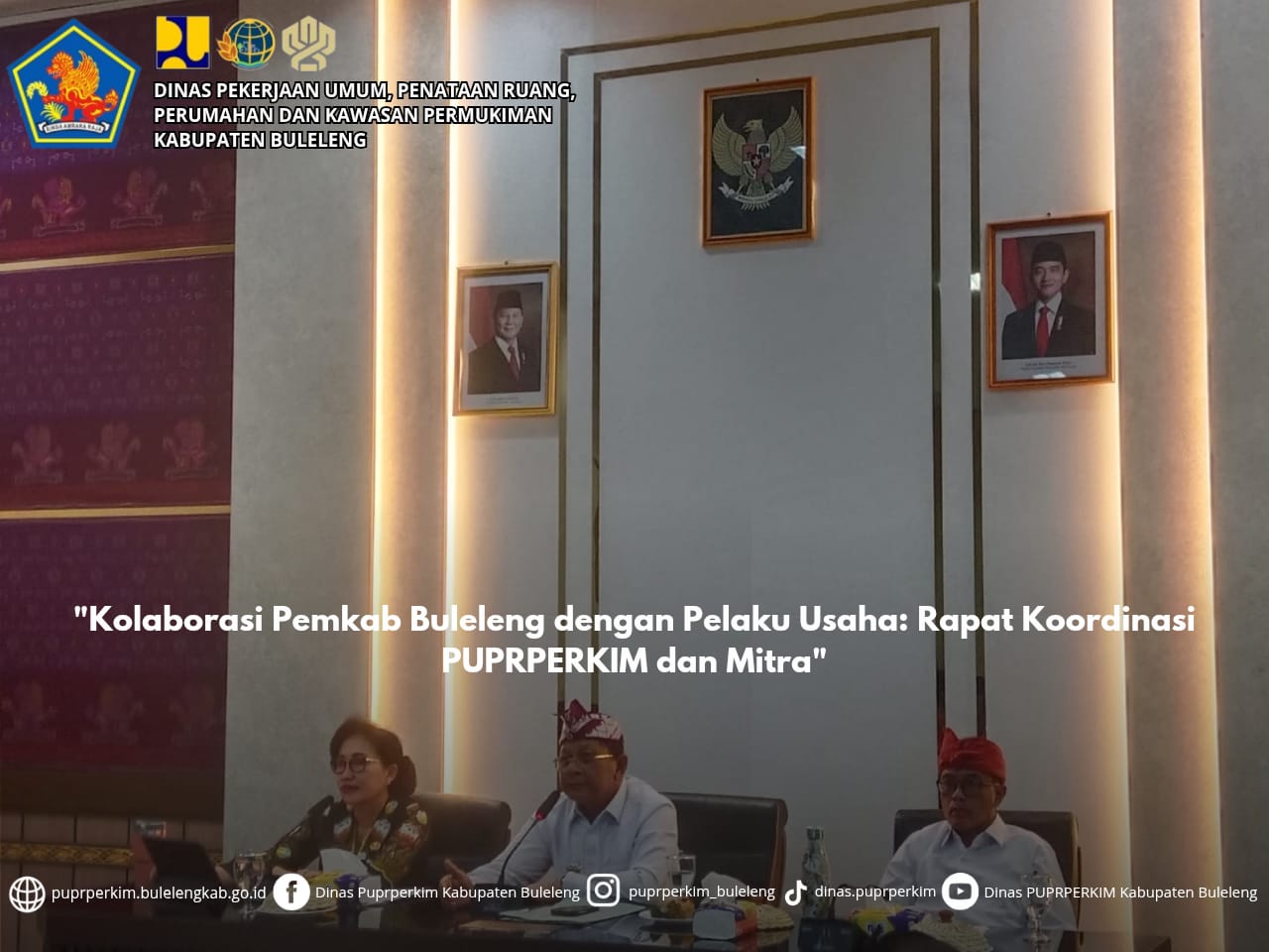Kepala Dinas PUPRPERKIM, I Putu Adiptha Ekaputra, menghadiri Rapat Koordinasi Kolaborasi antara Pemerintahan dan Pelaku Usaha, BUMD, serta BUMN di Kabupaten Buleleng. Rapat yang dibuka oleh Bupati Buleleng ini bertujuan untuk meningkatkan sinergi dan kerjasama dalam pembangunan daerah. Acara ini dilaksanakan di Ruang Rapat Bapeda Kabupaten Buleleng.