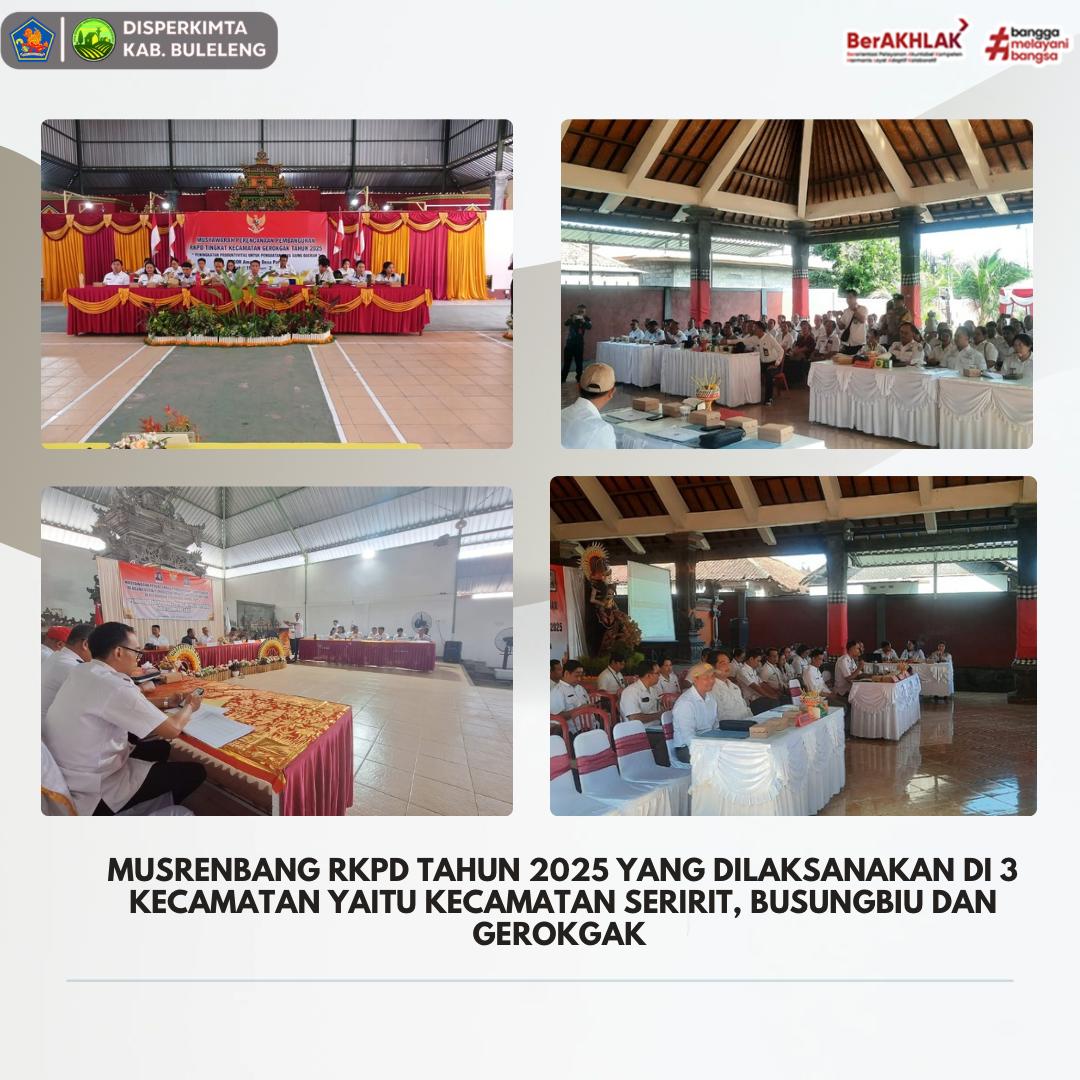 Rabu, 19 Februari 2025, Disperkimta menghadiri undangan pelaksanaan kegiatan Musrenbang tingkat Kecamatan Tahun 2025 yang dilaksanakan di 3 Kecamatan, yakni : Kecamatan Seririt, Kecamatan Busungbiu, dan Kecamatan Gerokgak. Kegiatan ini bertujuan untuk menerima usulan dan masukan dari masyarakat melalui Perbekel dan Perangkat Desa.