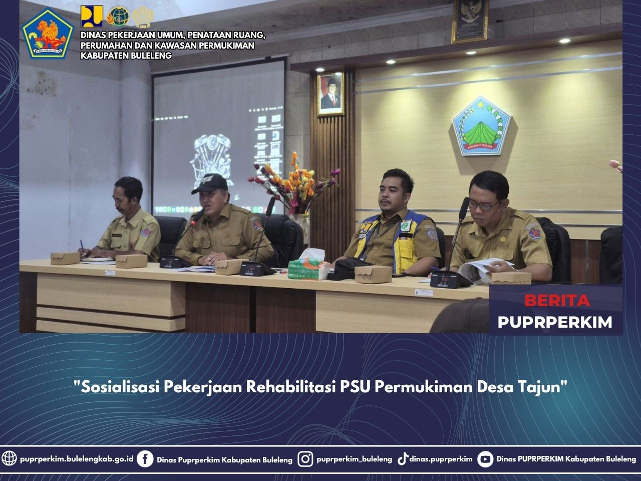 Bertempat di Kantor Desa Tajun. Jafung Bidang Perumahan Kawasan Permukiman beserta staf menghadiri rapat yang dilaksanakan oleh Dinas PUPRKIM Provinsi Bali dalam rangka pembahasan Sosialisasi Pekerjaan Rehabilitasi PSU Permukiman di Desa Tajun Kecamatan Kubutambahan Kabupaten Buleleng. dengan membahas lingkup pekerjaan fisik yang yang akan dilaksanakan selama 3 Bulan. mulai dari informasi, data teknis, serta metode pekerjaan
