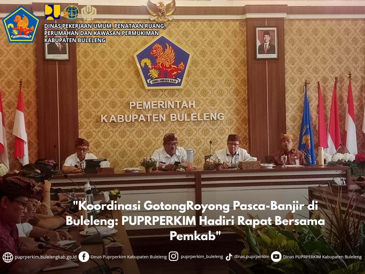 Kamis, 12 Maret 2023, Kepala Dinas PUPRPERKIM, I Putu Adiptha Ekaputra, menghadiri Rapat Koordinasi Terkait Kegiatan Gotong Royong pasca-bencana banjir di beberapa wilayah Kabupaten Buleleng. Rapat yang dibuka oleh Asisten 1 Kabupaten Buleleng ini bertujuan untuk membahas upaya penanganan bencana dan koordinasi antar lembaga.