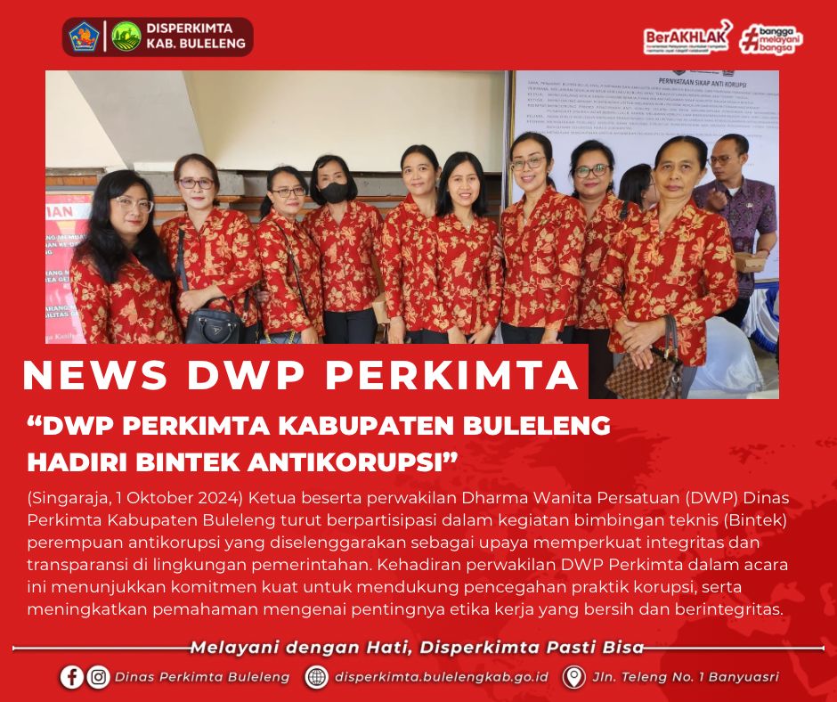 (Singaraja, 1 Oktober 2024) Ketua beserta perwakilan Dharma Wanita Persatuan (DWP) Dinas Perkimta Kabupaten Buleleng turut berpartisipasi dalam kegiatan bimbingan teknis (Bintek) perempuan antikorupsi yang diselenggarakan sebagai upaya memperkuat integritas dan transparansi di lingkungan pemerintahan.