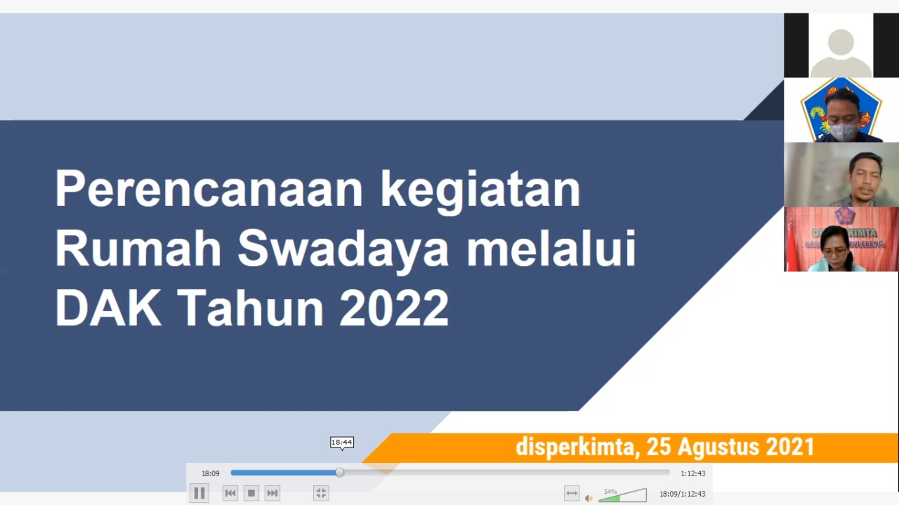 Rabu, 25 Agustus 2021. Kepala Dinas Perumahan, Kawasan Permukiman dan Pertanahan Kabupaten Buleleng Ni Nyoman Surattini, ST. bersama Kepala Bidang Kawasan Permukiman Made Agus Suardana, ST. menghadiri rapat mengenai Pembahasan Perencanaan Kegiatan Rumah Swadaya melalui dana DAK Tahun 2022 yang dilaksanakan secara daring melalui aplikasi Zoom Meeting dan juga turut hadir Kepala Bappeda Kab. Buleleng, Inspektorat Kab. Buleleng dan BPKPD.