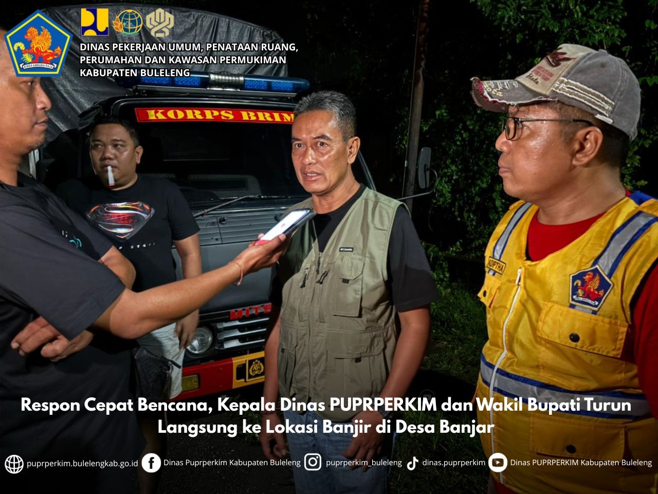 Pada hari Jumat, 6 Maret 2026 pukul 21.30 WITA, Kepala Dinas PUPRPERKIM Kabupaten Buleleng, I Putu Adiptha Ekaputra, turun langsung ke lapangan bersama Bapak Wakil Bupati Buleleng untuk meninjau kondisi bencana banjir yang terjadi di wilayah Desa Banjar.
