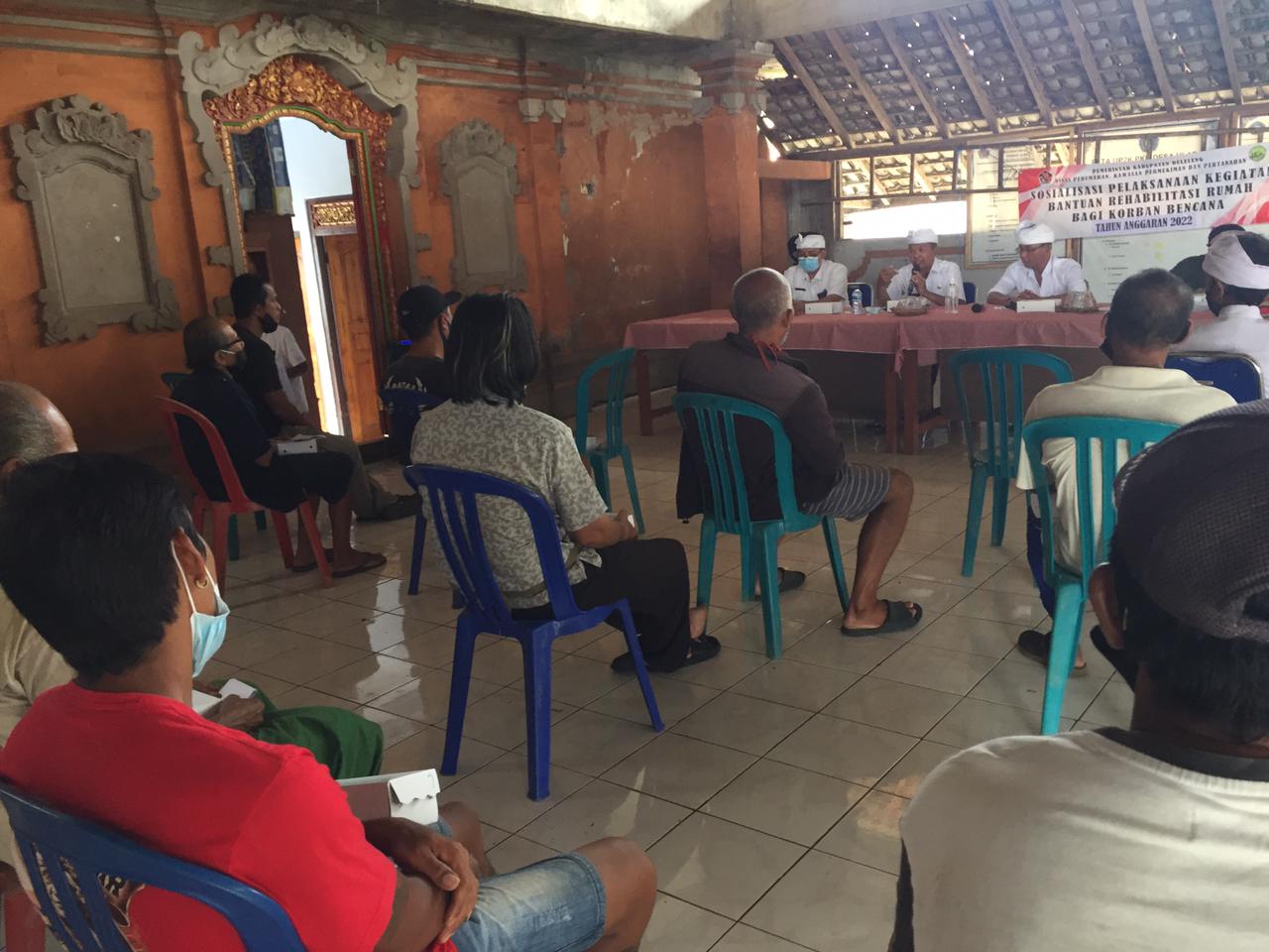 Kepala Bidang Perumahan, Bapak Ir. Nyoman Sumiadajana hadir langsung ke lokasi sebagai narasumber didampingi oleh beberapa staf Disperkimta di Bidang Perumahan. Kegiatan sosialisasi ini dilaksanakan untuk memberikan arahan atau pemahaman kepada masyarakat atau calon penerima bantuan Rumah Rehabilitasi Bagi Korban Bencana Alam terkait kebijakan yang berlaku dan nantinya program bisa terselesaikan tepat waktu.