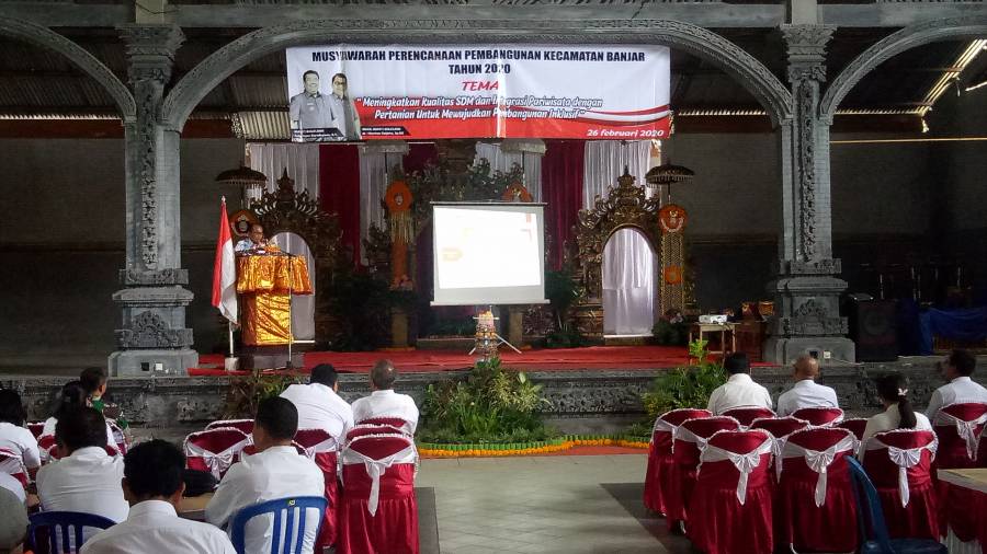 Pada hari Rabu tanggal 26 Pebruari 2020, pada pukul 09.00 wita telah dilaksanakan Musyawarah Perencanaan Pembangunan Tingkat Kecamatan (Musrenbangcam) Banjar yang berlokasi di Gedung Serba Guna Desa Banyuatis, Kecamatan Banjar. Dengan tema “Meningkatkan Kualitas Sumber Daya Manusia dan Integrasi Pariwisata Dengan Pertanian Untuk Mewujudkan Pembangunan Inklusif”. Musrenbangcam Banjar dihadiri oleh undangan yang berasal dari utusan/delegasi masing-masing desa se-Kecamatan, Kepala Desa seKecamatan Banjar, Anggota DPR Dapil Banjar, Dinas Nivo dan LSM, Perwakilan SKPD terkait, Unsur Muspika Kecamatan Banjar, BPD dan TP PKK Kecamatan, LPM, dan Kelian Desa se-Kecamatan Banjar. Hadir pada kegiatan ini Kepala Bappeda Kabupaten Buleleng, I Nyoman Genep, MT. dan Camat Buleleng I Gede Arya Suardana,AP.MM.