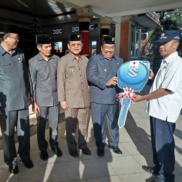Bupati Buleleng, Putu Agus Suradnyana, ST didampingi Wakil Bupati Buleleng, dr. I Nyoman Sutjidra, Sp.OG, Ketua DPRD Buleleng, Gede Supriatna, SH dan Sekkab Buleleng, Ir. Dewa Ketut Puspaka, MP menyerahkan bantuan mobil ambulans kepada PMI Cabang Buleleng yang diterima langsung oleh Sekretaris PMI Cabang Buleleng, Dr. Gede Sandiasa, S.Sos.,M.Si di halaman Kantor Bupati Buleleng, Jumat (1/6). Penyerahan ini dirangkaikan dengan Upacara Hari Kelahiran Pancasila.