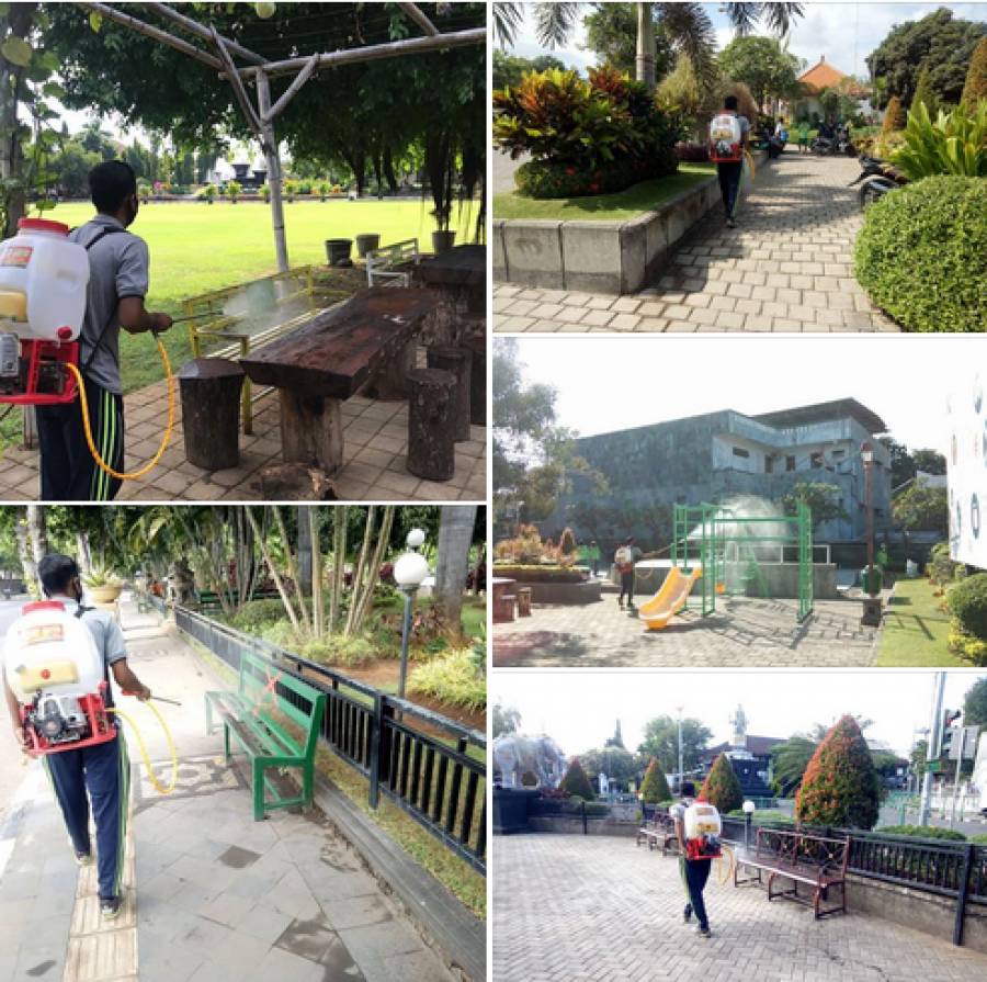 Kegiatan penyemprotan disinfectant di Taman Kota, Taman Bung Karno, Taman Yuwana Asri dan Taman Panji Sakti. Penyemprotan disinfectant dilakukan untuk tetap menjaga fasilitas umum yang tersedia tetap bersih dan aman di era New Normal.