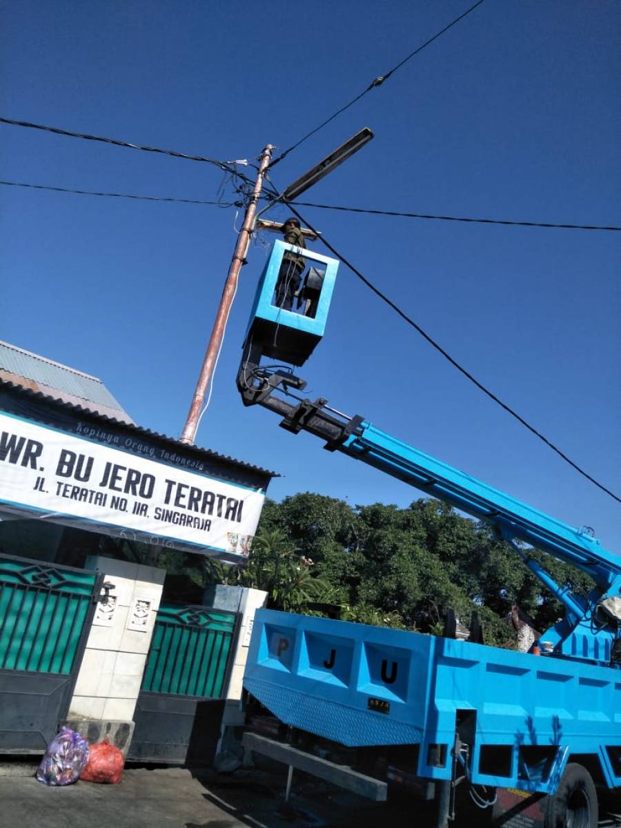 Singaraja, 12 Juni 2019 tenaga pemeliharaan Penerangan Jalan Umum (PJU) Dinas Pekerjaan Umum dan Penataan Ruang Kabupaten Buleleng melakukan perbaikan/penanganan lampu penerangan jalan umum berupa Perbaikan Lampu TL 40 watt di jalan Teratai - Singaraja dengan menggunakan truk skylift. Segala pelaksanaan kegiatan pemeliharaan Penerangan Jalan Umum atau yang disingkat PJU ini adalah merupakan salah satu kegiatan yang menjadi tugas pokok dan fungsi dari Dinas PUPR Kabupaten Buleleng yang bertujuan untuk memberi kenyamanan dan keamanan bagi para pengguna jalan terutama saat di malam hari. *HMd*