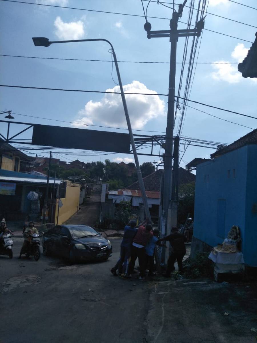 para tenaga pemeliharaan Penerangan Jalan Umum (PJU) Dinas Pekerjaan Umum dan Penataan Ruang Kabupaten Buleleng secara manual dan bersama - sama mendirikan tiang lampu penerangan jalan umum dengan kompak, demi tersedianya penerangan jalan umum yang layak untuk meningkatkan kenyamanan dan keamanan para pengguna jalan. *HMd*